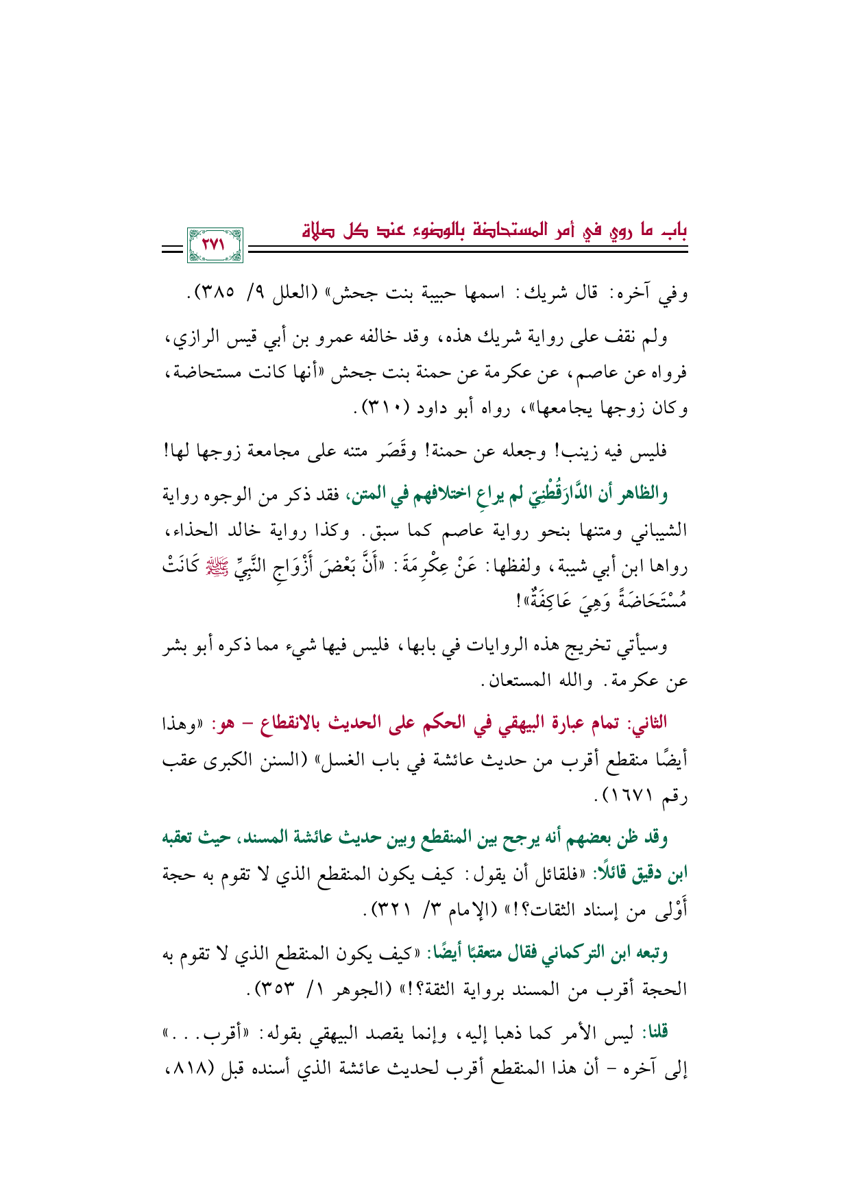 والظاهر أن الدَّارَقُطْنِيّ لم يراعِ اختلافهم في المتن، فقد ذكر من الوجوه رواية الشيباني ومتنها بنحو رواية عاصم كما سبق. وكذا رواية خالد الحذاء، رواها ابن أبي شيبة، ولفظها: عَنْ عِكْرِمَةَ: ((أَنَّ بَعْضَ أَزْوَاجِ النَّبِيِّ صَلَّى اللهُ عَلَيْهِ وَسَلَّمَ كَانَتْ مُسْتَحَاضَةً وَهِيَ عَاكِفَةٌ))!