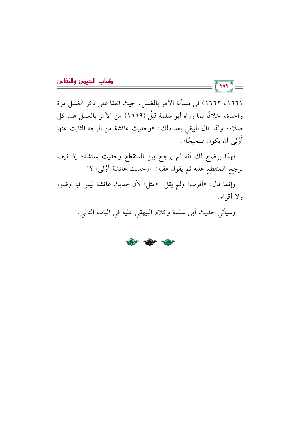 ١٦٦١، ١٦٦٢) في مسألة الأمر بالغسل، حيث اتفقا على ذكر الغسل مرة واحدة، خلافًا لما رواه أبو سلمة قبلُ (١٦٦٩) من الأمر بالغسل عند كل صلاة؛ ولذا قال البيقي بعد ذلك: ((وحديث عائشة من الوجه الثابت عنها أَوْلى أن يكون صحيحًا)).