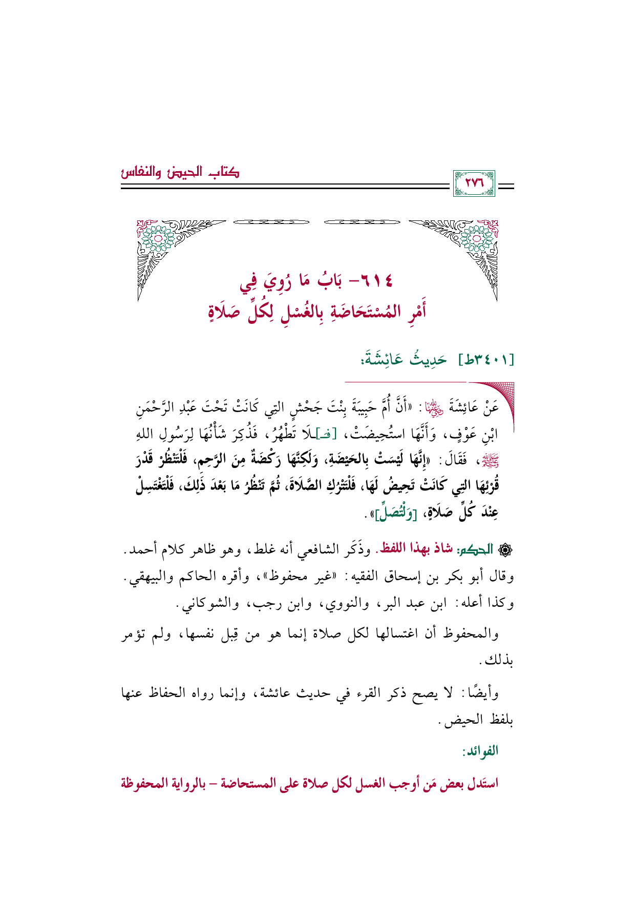 استَدل بعض مَن أوجب الغسل لكل صلاة على المستحاضة- بالرواية المحفوظة