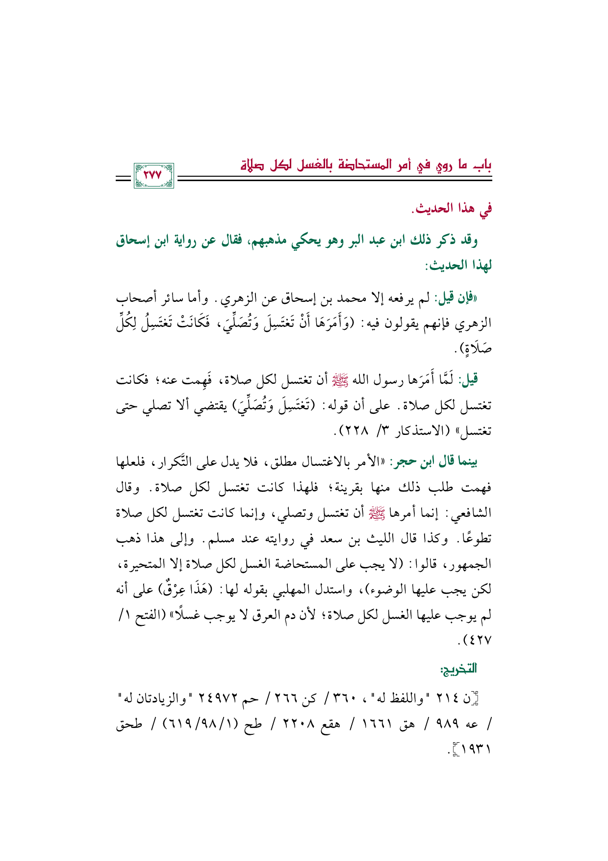 ((فإن قيل: لم يرفعه إلا محمد بن إسحاق عن الزهري. وأما سائر أصحاب الزهري فإنهم يقولون فيه: (وَأَمَرَهَا أَنْ تَغتَسِلَ وَتُصَلِّيَ، فَكَانَتْ تَغتَسِلُ لِكُلِّ صَلَاةٍ).