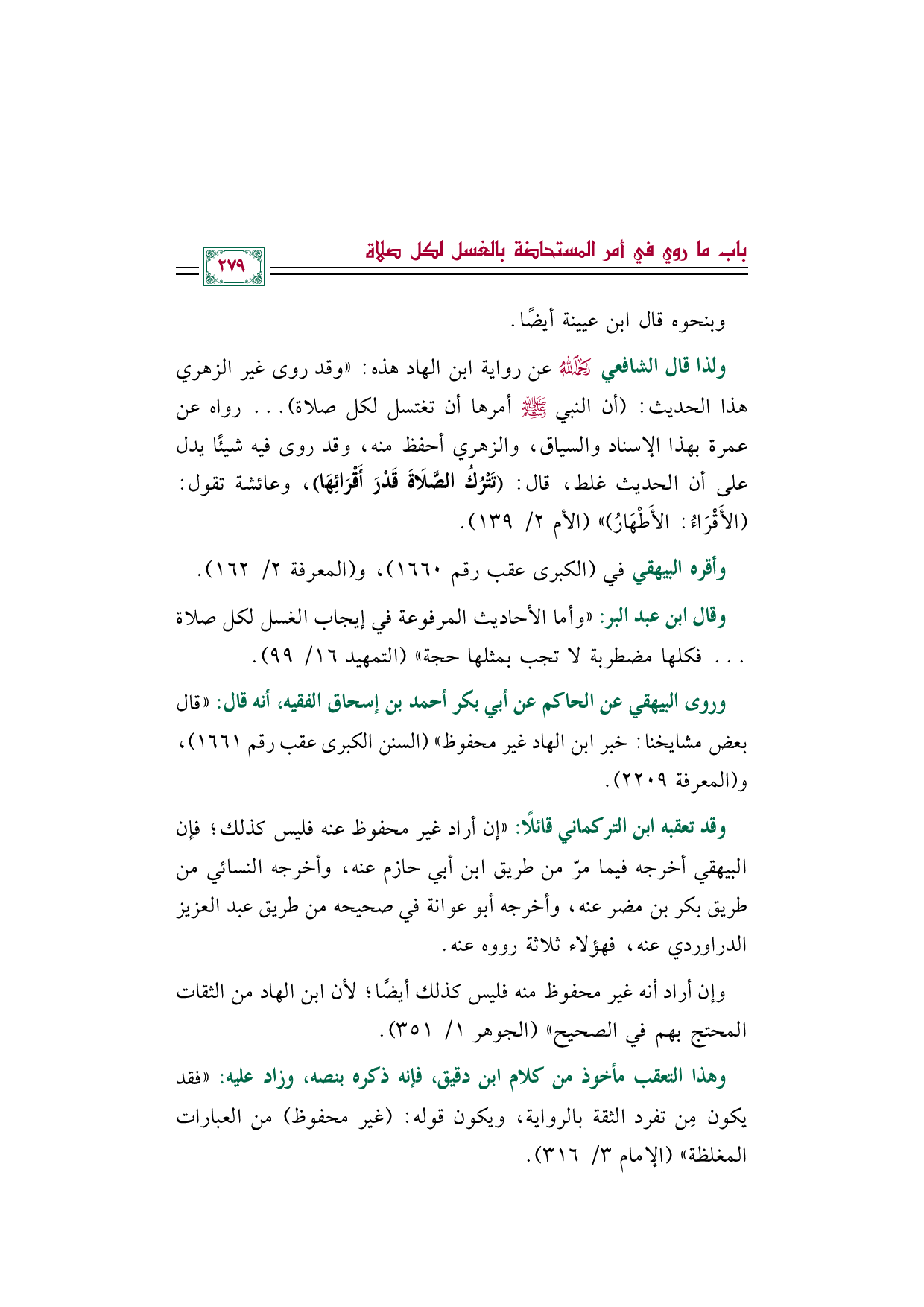 وقال ابن عبد البر: ((وأما الأحاديث المرفوعة في إيجاب الغسل لكل صلاة ... فكلها مضطربة لا تجب بمثلها حجة)) (التمهيد ١٦/ ٩٩).