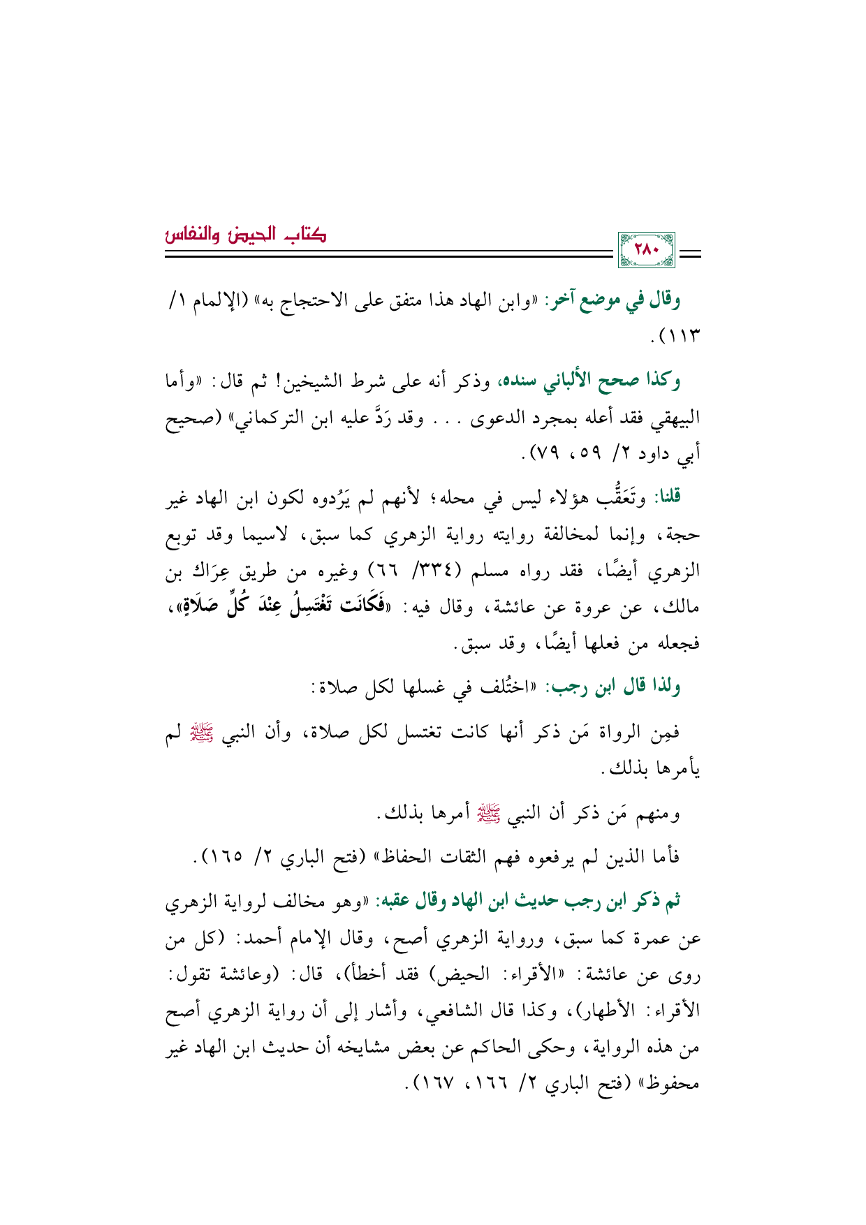 قلنا: وتَعَقُّب هؤلاء ليس في محله؛ لأنهم لم يَرُدوه لكون ابن الهاد غير حجة، وإنما لمخالفة روايته رواية الزهري كما سبق، لاسيما وقد توبع الزهري أيضًا، فقد رواه مسلم (٣٣٤/ ٦٦) وغيره من طريق عِرَاك بن مالك، عن عروة عن عائشة، وقال فيه: ((فَكَانَت تَغْتَسِلُ عِنْدَ كُلِّ صَلَاةٍ))، فجعله من فعلها أيضًا، وقد سبق.