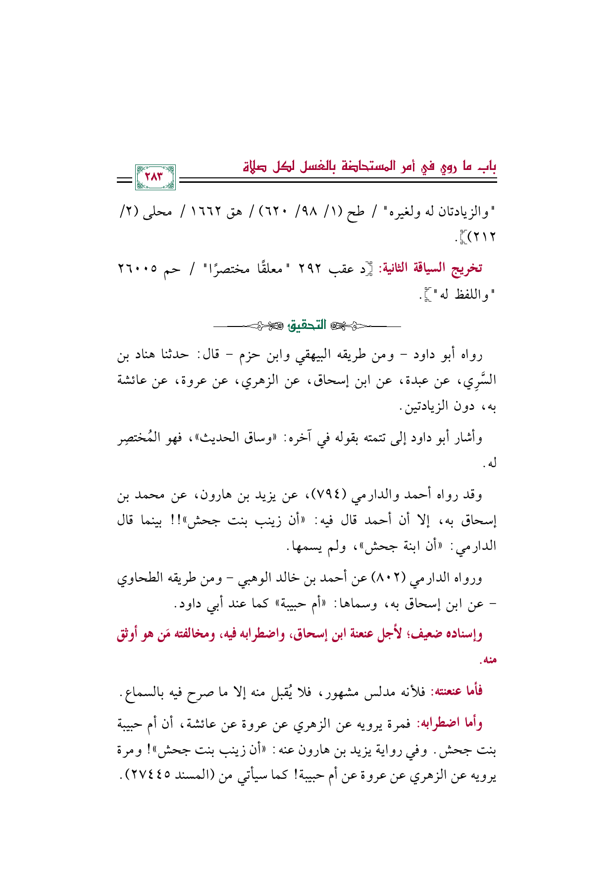 وقد رواه أحمد والدارمي (٧٩٤)، عن يزيد بن هارون، عن محمد بن إسحاق به، إلا أن أحمد قال فيه: ((أن زينب بنت جحش))! ! بينما قال الدارمي: ((أن ابنة جحش))، ولم يسمها.