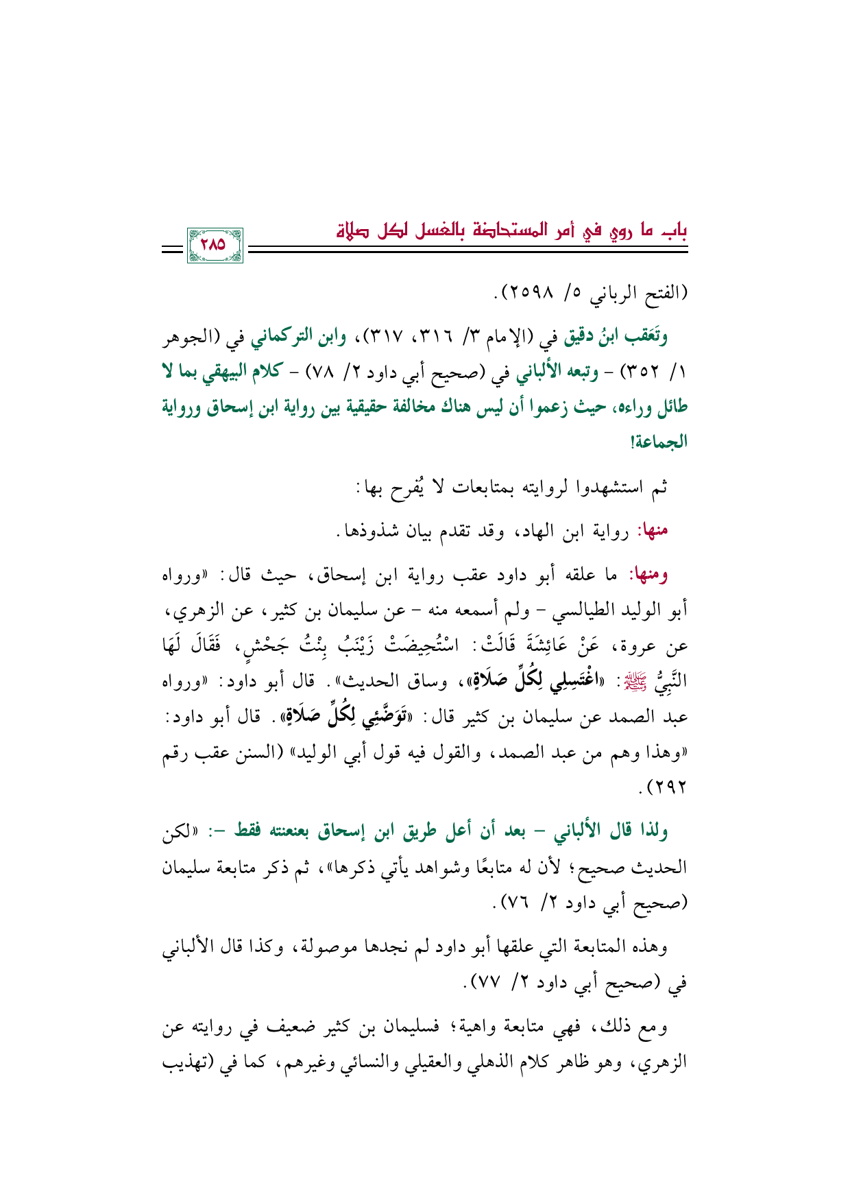 وتَعَقب ابنُ دقيق في (الإمام ٣/ ٣١٦، ٣١٧)، وابن التركماني في (الجوهر ١/ ٣٥٢) -وتبعه الألباني في (صحيح أبي داود ٢/ ٧٨) - كلام البيهقي بما لا طائل وراءه، حيث زعموا أن ليس هناك مخالفة حقيقية بين رواية ابن إسحاق ورواية الجماعة!