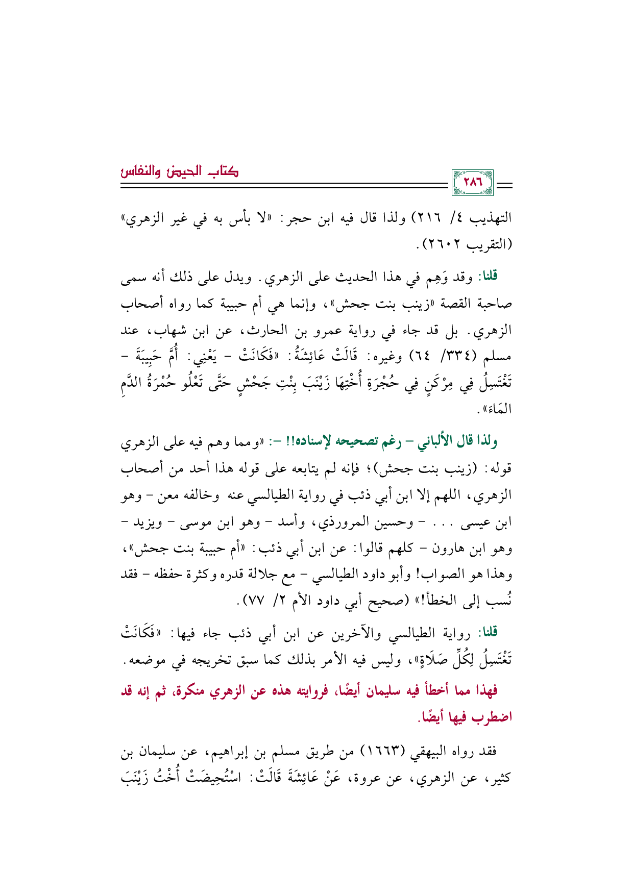 قلنا: وقد وَهِم في هذا الحديث على الزهري. ويدل على ذلك أنه سمى صاحبة القصة ((زينب بنت جحش))، وإنما هي أم حبيبة كما رواه أصحاب الزهري. بل قد جاء في رواية عمرو بن الحارث، عن ابن شهاب، عند مسلم (٣٣٤/ ٦٤) وغيره: قَالَتْ عَائِشَةُ: ((فَكَانَتْ - يَعْنِي: أُمَّ حَبِيبَةَ - تَغْتَسِلُ فِي مِرْكَنٍ فِي حُجْرَةِ أُخْتِهَا زَيْنَبَ بِنْتِ جَحْشٍ حَتَّى تَعْلُو حُمْرَةُ الدَّمِ المَاءَ)).