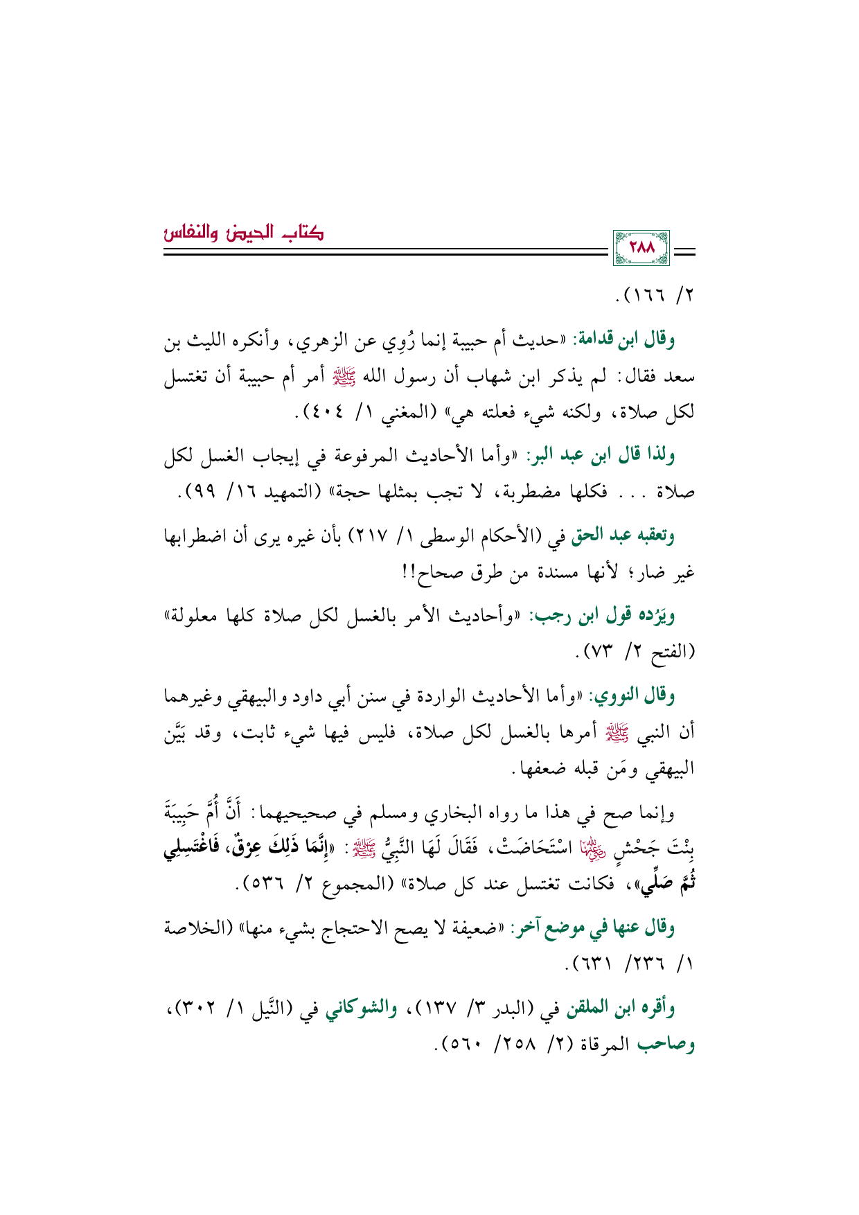 وقال ابن قدامة: ((حديث أم حبيبة إنما رُوِي عن الزهري، وأنكره الليث بن سعد فقال: لم يذكر ابن شهاب أن رسول الله صلى الله عليه وسلم أمر أم حبيبة أن تغتسل لكل صلاة، ولكنه شيء فعلته هي)) (المغني ١/ ٤٠٤).