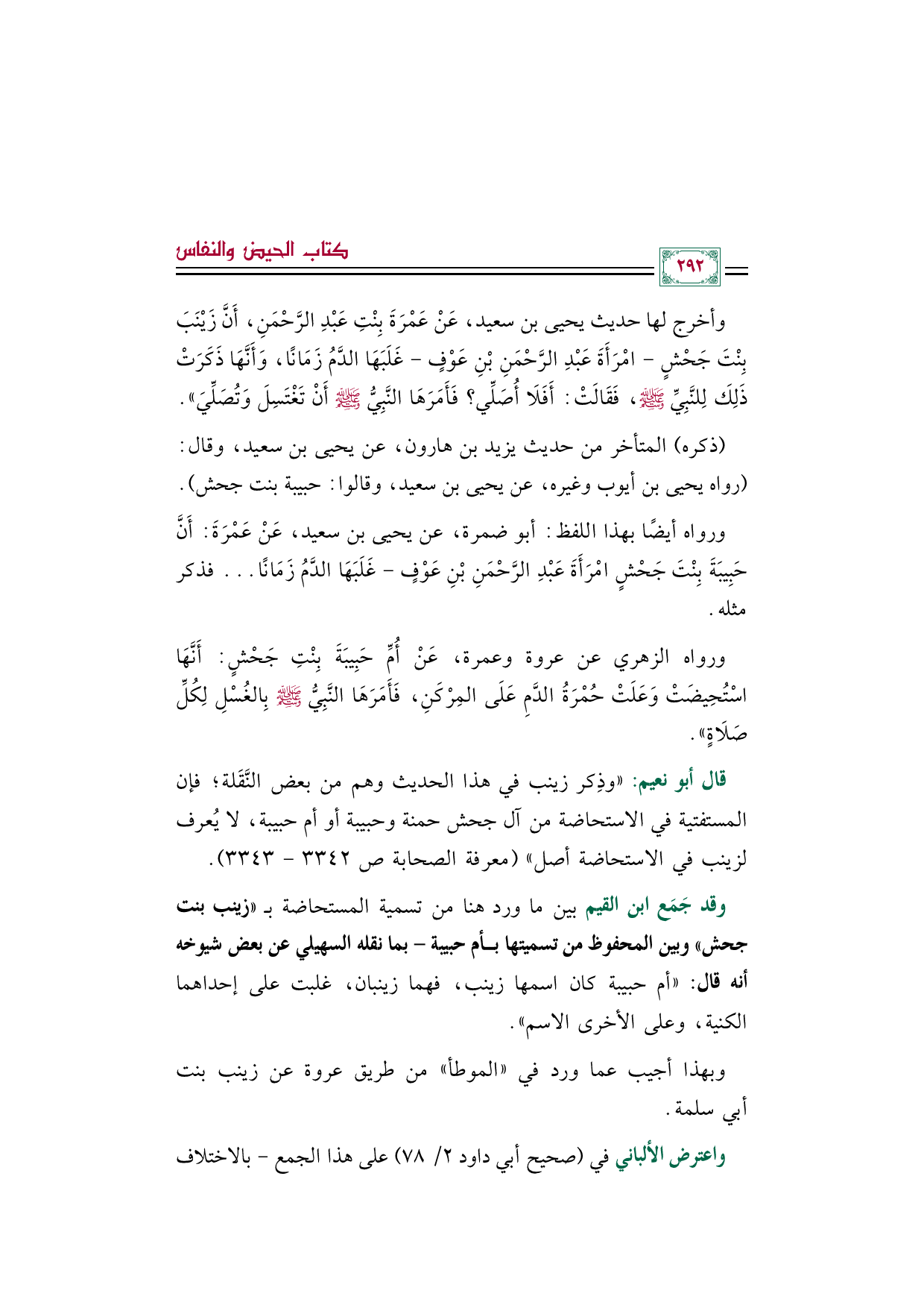 وقد جَمَع ابن القيم بين ما ورد هنا من تسمية المستحاضة بـ ((زينب بنت جحش)) وبين المحفوظ من تسميتها بأم حبيبة- بما نقله السهيلي عن بعض شيوخه أنه قال: ((أم حبيبة كان اسمها زينب، فهما زينبان، غلبت على إحداهما الكنية، وعلى الأخرى الاسم)).