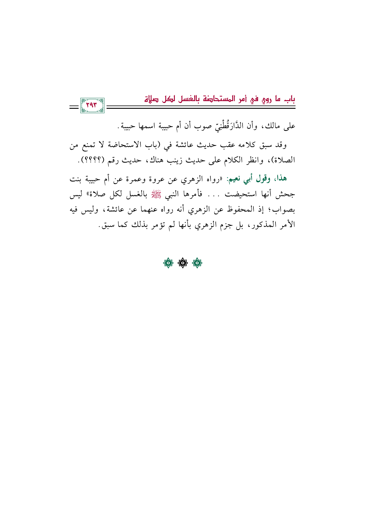 هذا، وقول أبي نعيم: ((رواه الزهري عن عروة وعمرة عن أم حبيبة بنت جحش أنها استحيضت ... فأمرها النبي صلى الله عليه وسلم بالغسل لكل صلاة)) ليس بصواب؛ إذ المحفوظ عن الزهري أنه رواه عنهما عن عائشة، وليس فيه الأمر المذكور، بل جزم الزهري بأنها لم تؤمر بذلك كما سبق.