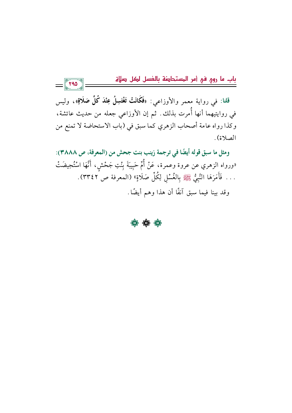 ومثل ما سبق قوله أيضًا في ترجمة زينب بنت جحش من (المعرفة، ص ٣٨٨٨): ((ورواه الزهري عن عروة وعمرة، عَنْ أُمِّ حَبِيبَةَ بِنْتِ جَحْشٍ، أَنَّهَا اسْتُحِيضَتْ ... فَأَمَرَهَا النَّبِيُّ صَلَّى اللهُ عَلَيْهِ وَسَلَّمَ بِالغُسْلِ لِكُلِّ صَلَاةٍ)) (المعرفة ص ٣٣٤٢).