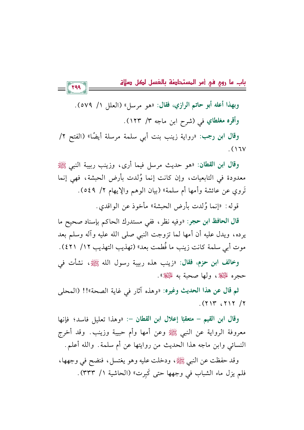وقال ابن القطان: ((هو حديث مرسل فيما أرى، وزينب ربيبة النبي صلى الله عليه وسلم معدودة في التابعيات، وإن كانت إنما وُلدت بأرض الحبشة، فهي إنما تَروي عن عائشة وأمها أم سلمة)) (بيان الوهم والإيهام ٢/ ٥٤٩).