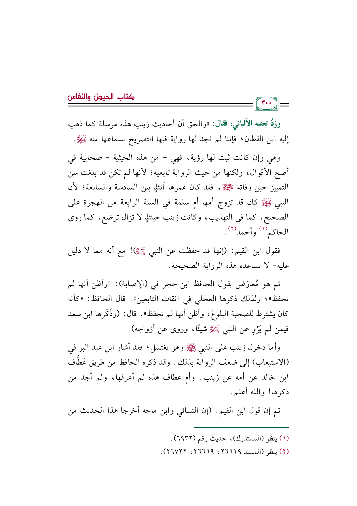 ورَدَّ تعقبه الألباني، فقال: ((والحق أن أحاديث زينب هذه مرسلة كما ذهب إليه ابن القطان؛ فإننا لم نجد لها رواية فيها التصريح بسماعها منه صلى الله عليه وسلم.