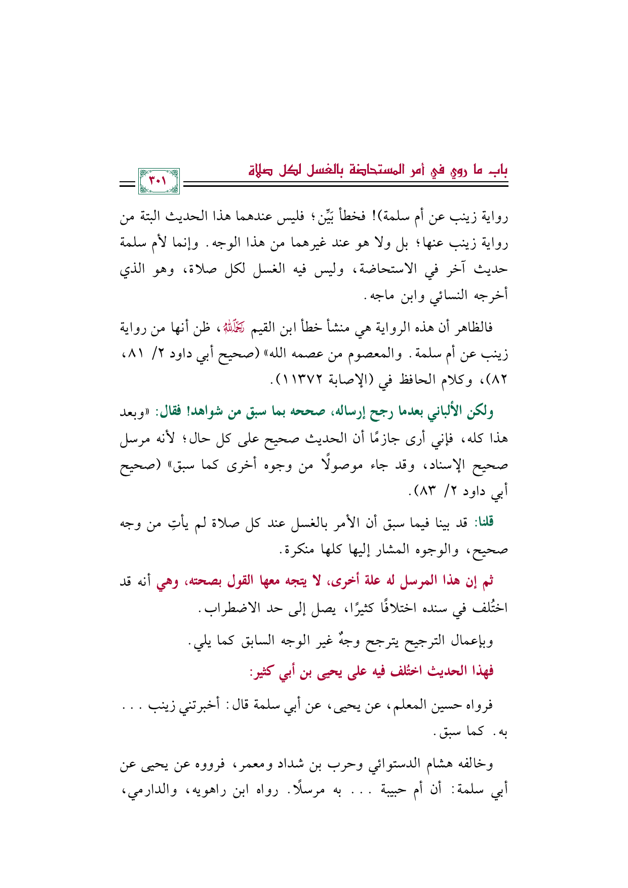 رواية زينب عن أم سلمة)! فخطأ بَيِّن؛ فليس عندهما هذا الحديث البتة من رواية زينب عنها؛ بل ولا هو عند غيرهما من هذا الوجه. وإنما لأم سلمة حديث آخر في الاستحاضة، وليس فيه الغسل لكل صلاة، وهو الذي أخرجه النسائي وابن ماجه.