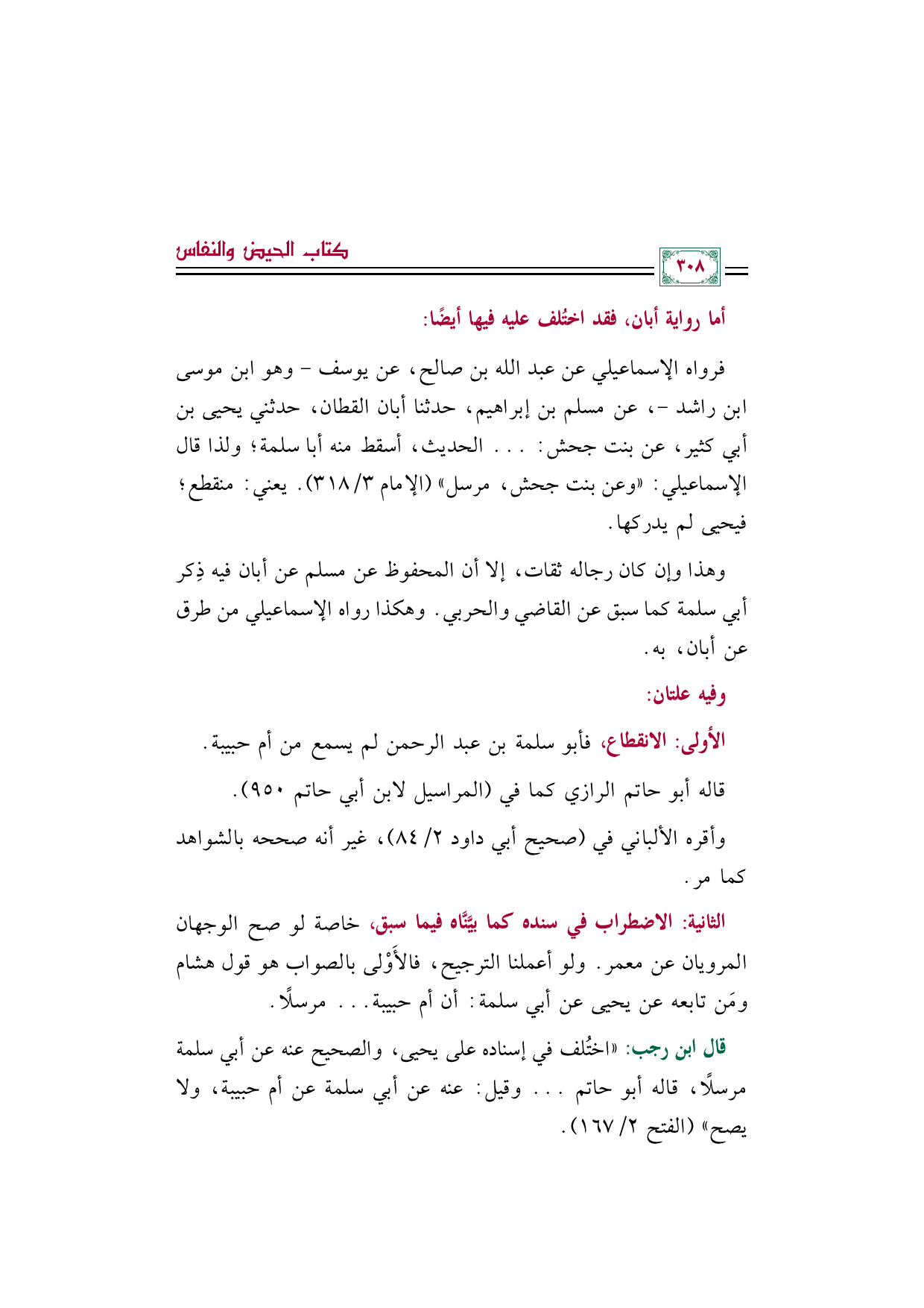 الثانية: الاضطراب في سنده كما بيَّنَّاه فيما سبق، خاصة لو صح الوجهان المرويان عن معمر. ولو أعملنا الترجيح، فالأَوْلى بالصواب هو قول هشام ومَن تابعه عن يحيى عن أبي سلمة: أن أم حبيبة ... مرسلًا.