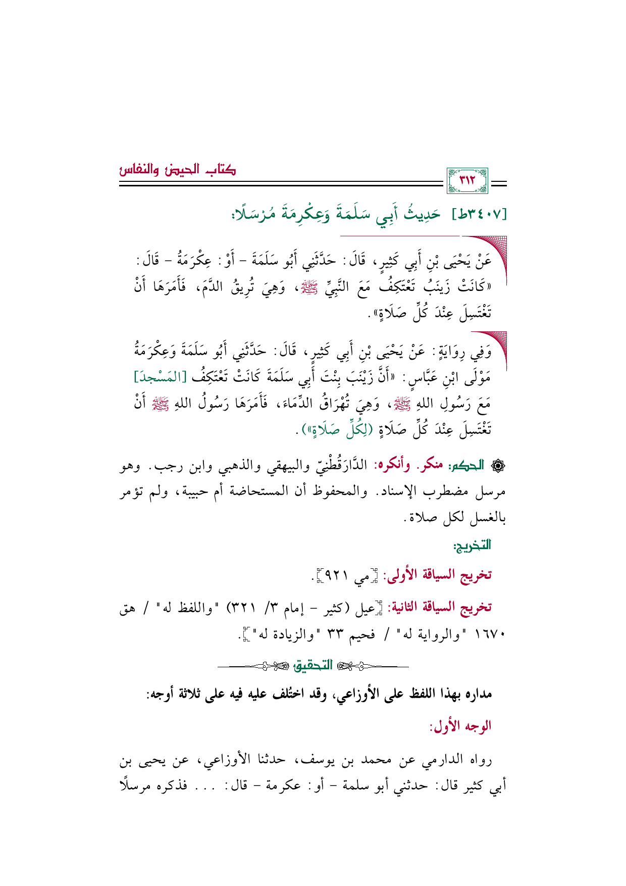 • وَفِي رِوَايَةٍ: عَنْ يَحْيَى بْنِ أَبِي كَثِيرٍ، قَالَ: حَدَّثَنِي أَبُو سَلَمَةَ وَعِكْرَمَةُ مَوْلَى ابْنِ عَبَّاسٍ: ((أَنَّ زَيْنَبَ بِنْتَ أَبِي سَلَمَةَ كَانَتْ تَعْتَكِفُ [المَسْجدَ] مَعَ رَسُولِ اللهِ صَلَّى اللهُ عَلَيْهِ وَسَلَّمَ، وَهِيَ تُهْرَاقُ الدِّمَاءَ، فَأَمَرَهَا رَسُولُ اللهِ صَلَّى اللهُ عَلَيْهِ وَسَلَّمَ أَنْ تَغْتَسِلَ عِنْدَ كُلِّ صَلَاةٍ (لِكُلِّ صَلَاةٍ))).