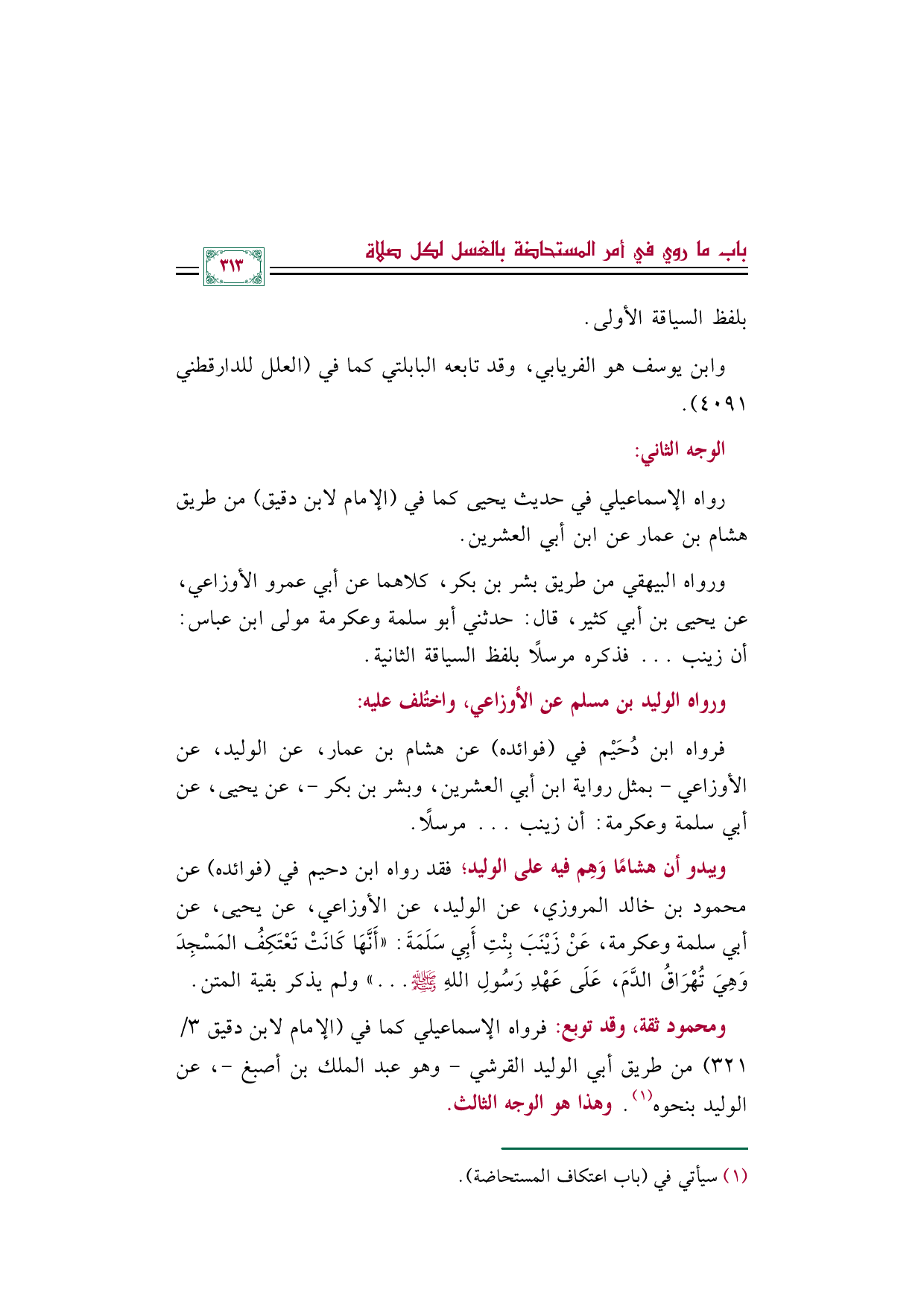 ويبدو أن هشامًا وَهِم فيه على الوليد؛ فقد رواه ابن دحيم في (فوائده) عن محمود بن خالد المروزي، عن الوليد، عن الأوزاعي، عن يحيى، عن أبي سلمة وعكرمة، عَنْ زَيْنَبَ بِنْتِ أَبِي سَلَمَةَ: ((أَنَّهَا كَانَتْ تَعْتَكِفُ المَسْجِدَ وَهِيَ تُهْرَاقُ الدَّمَ، عَلَى عَهْدِ رَسُولِ اللهِ صَلَّى اللهُ عَلَيْهِ وَسَلَّمَ ... )) ولم يذكر بقية المتن.