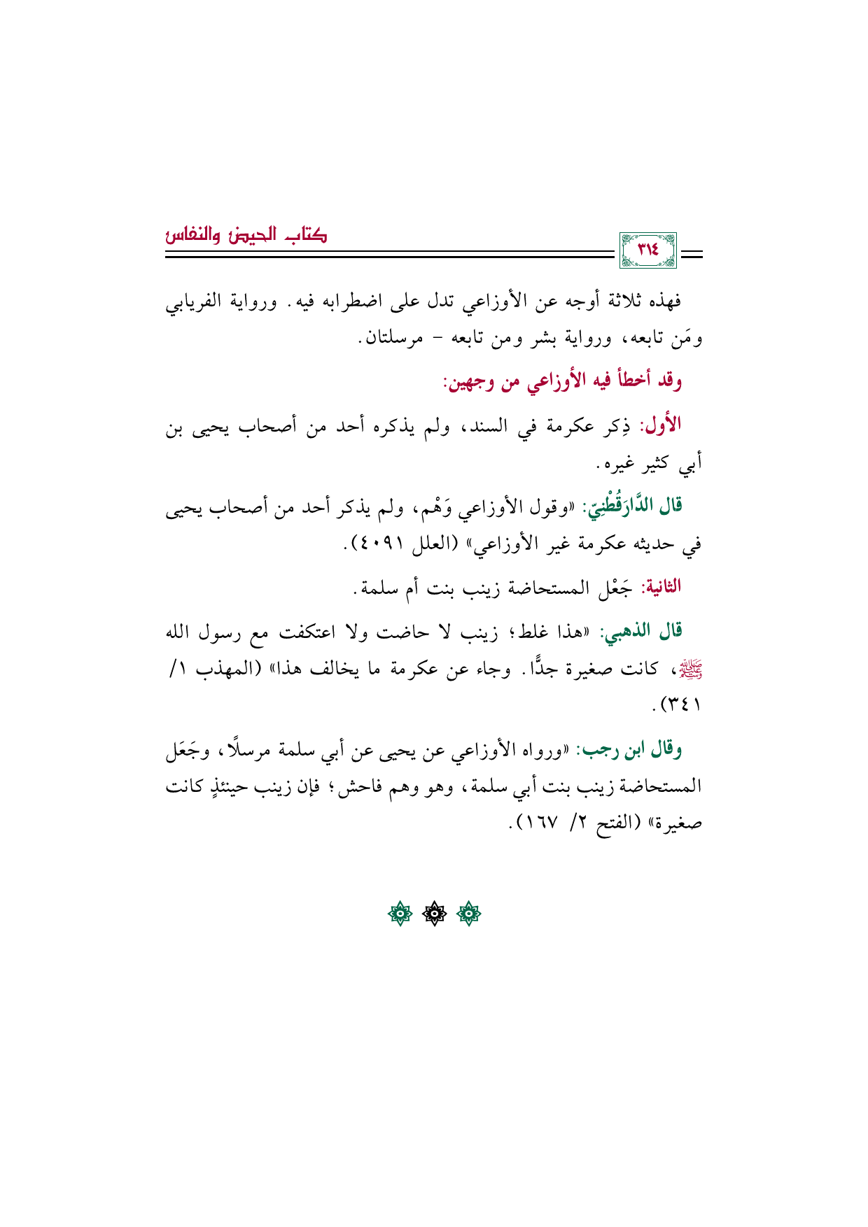 وقال ابن رجب: ((ورواه الأوزاعي عن يحيى عن أبي سلمة مرسلًا، وجَعَل المستحاضة زينب بنت أبي سلمة، وهو وهم فاحش؛ فإن زينب حينئذٍ كانت صغيرة)) (الفتح ٢/ ١٦٧).