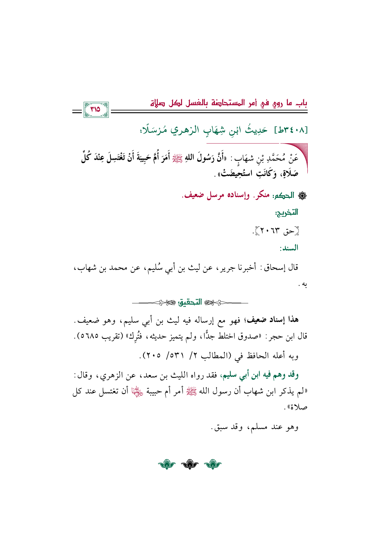 وقد وهم فيه ابن أبي سليم، فقد رواه الليث بن سعد، عن الزهري، وقال: ((لم يذكر ابن شهاب أن رسول الله صلى الله عليه وسلم أمر أم حبيبة رضي الله عنها أن تغتسل عند كل صلاة)).