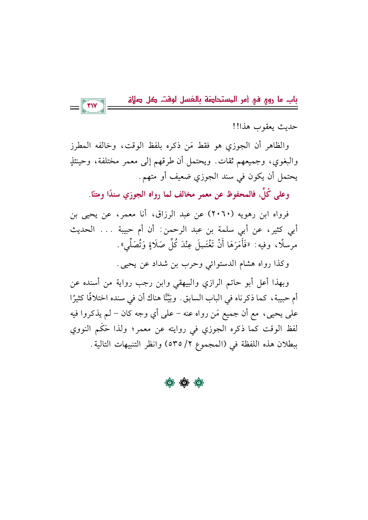 وبهذا أعل أبو حاتم الرازي والبيهقي وابن رجب رواية من أسنده عن أم حبيبة، كما ذكرناه في الباب السابق. وبَيَّنَّا هناك أن في سنده اختلافًا كثيرًا على يحيى، مع أن جميع مَن رواه عنه -على أي وجه كان- لم يذكروا فيه لفظ الوقت كما ذكره الجوزي في روايته عن معمر؛ ولذا حَكَم النووي ببطلان هذه اللفظة في (المجموع ٢/ ٥٣٥) وانظر التنبيهات التالية.