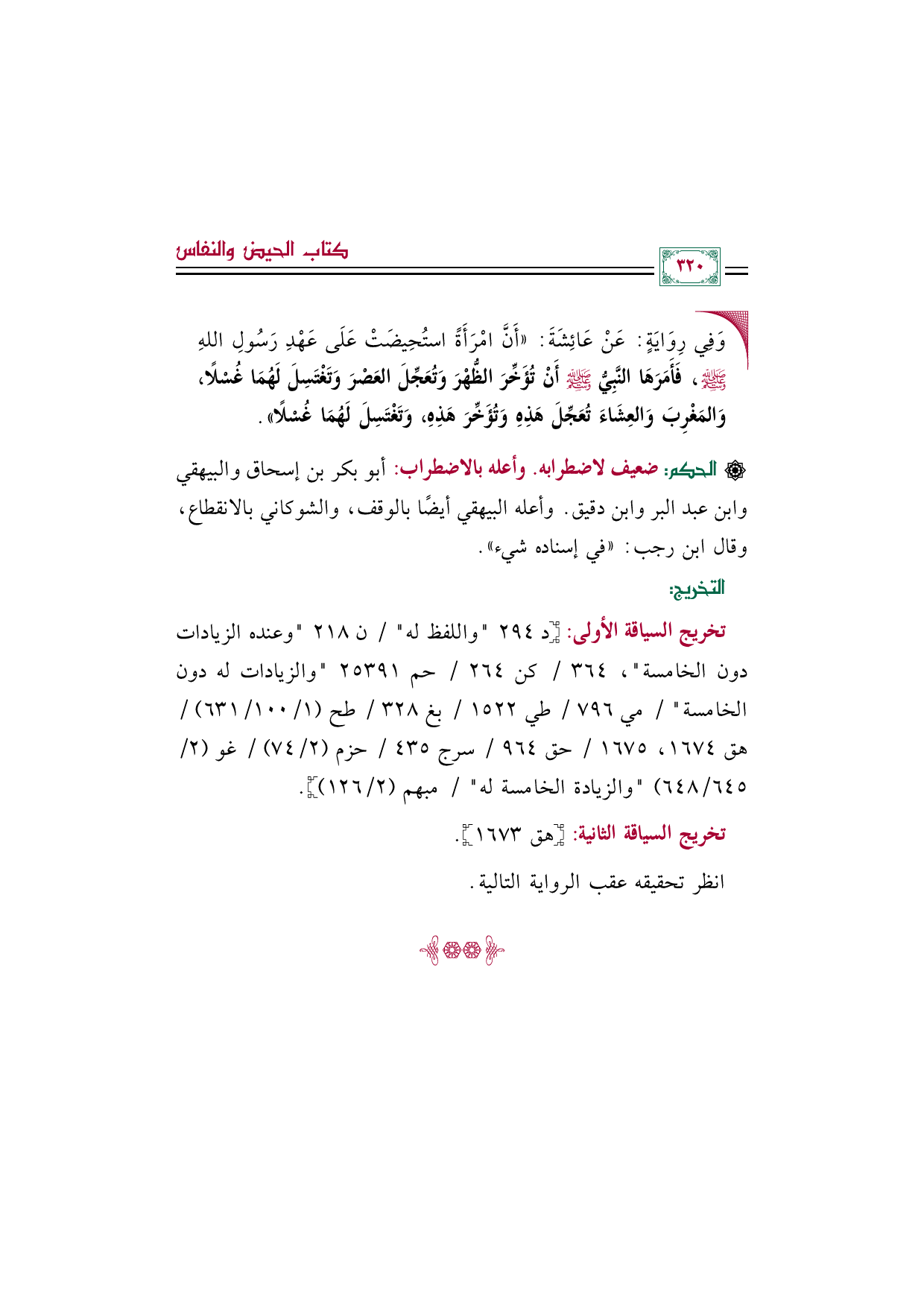 تخريج السياقة الأولى: [د ٢٩٤ "واللفظ له" / ن ٢١٨ وعنده الزيادات دون الخامسة، ٣٦٤/ كن ٢٦٤/ حم ٢٥٣٩١ والزيادات له دون الخامسة / مي ٧٩٦/ طي ١٥٢٢/ بغ ٣٢٨/ طح (١/ ١٠٠/ ٦٣١) / هق ١٦٧٤، ١٦٧٥/ حق ٩٦٤/ سرج ٤٣٥/ حزم (٢/ ٧٤) / غو (٢/ ٦٤٥/ ٦٤٨) والزيادة الخامسة له/ مبهم (٢/ ١٢٦)].