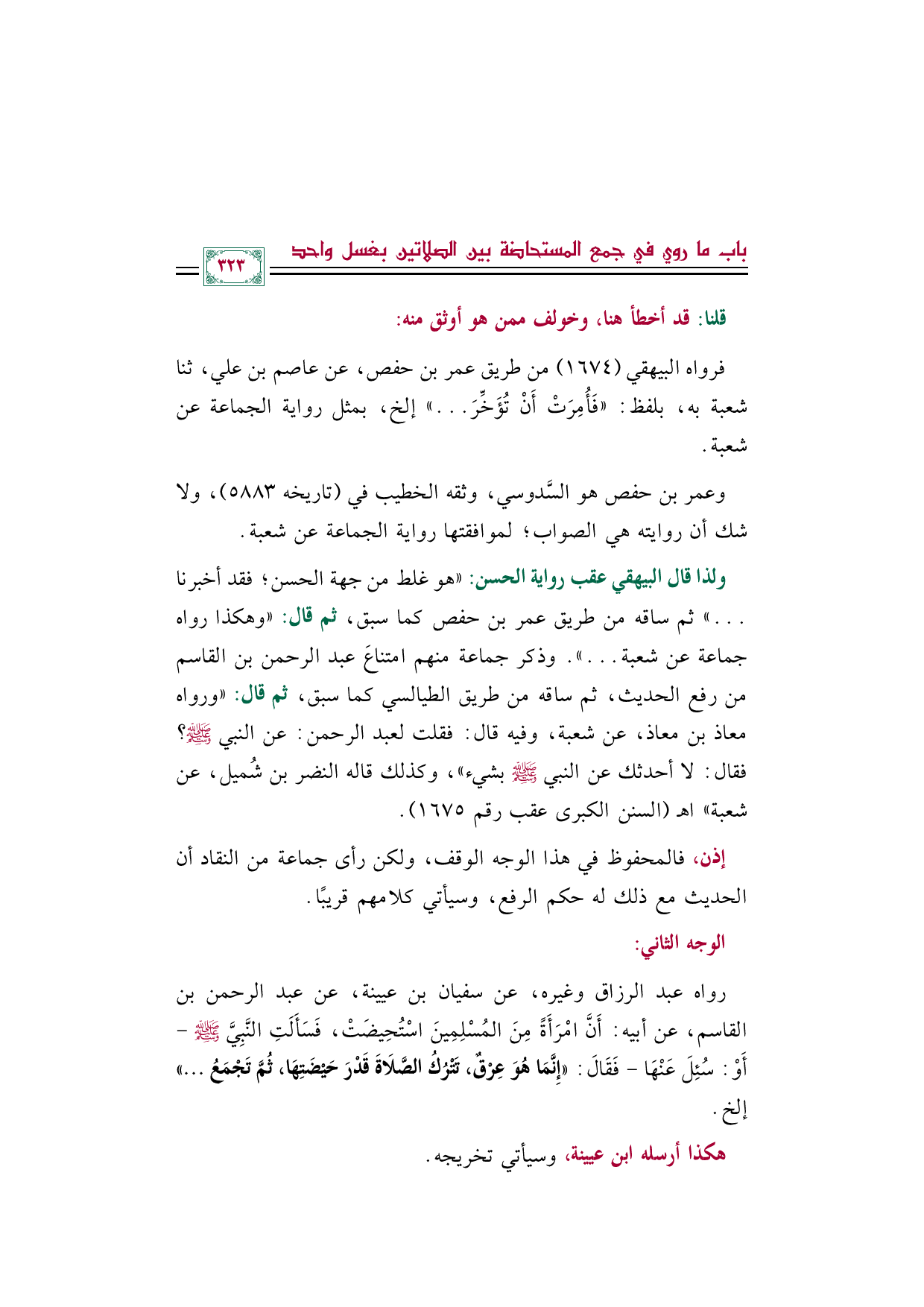 ولذا قال البيهقي عقب رواية الحسن: ((هو غلط من جهة الحسن؛ فقد أخبرنا ... )) ثم ساقه من طريق عمر بن حفص كما سبق، ثم قال: ((وهكذا رواه جماعة عن شعبة ... )). وذكر جماعة منهم امتناعَ عبد الرحمن بن القاسم من رفع الحديث، ثم ساقه من طريق الطيالسي كما سبق، ثم قال: ((ورواه معاذ بن معاذ، عن شعبة، وفيه قال: فقلت لعبد الرحمن: عن النبي صلى الله عليه وسلم؟ فقال: لا أحدثك عن النبي صلى الله عليه وسلم بشيء))، وكذلك قاله النضر بن شُميل، عن شعبة)) اهـ (السنن الكبرى عقب رقم ١٦٧٥).