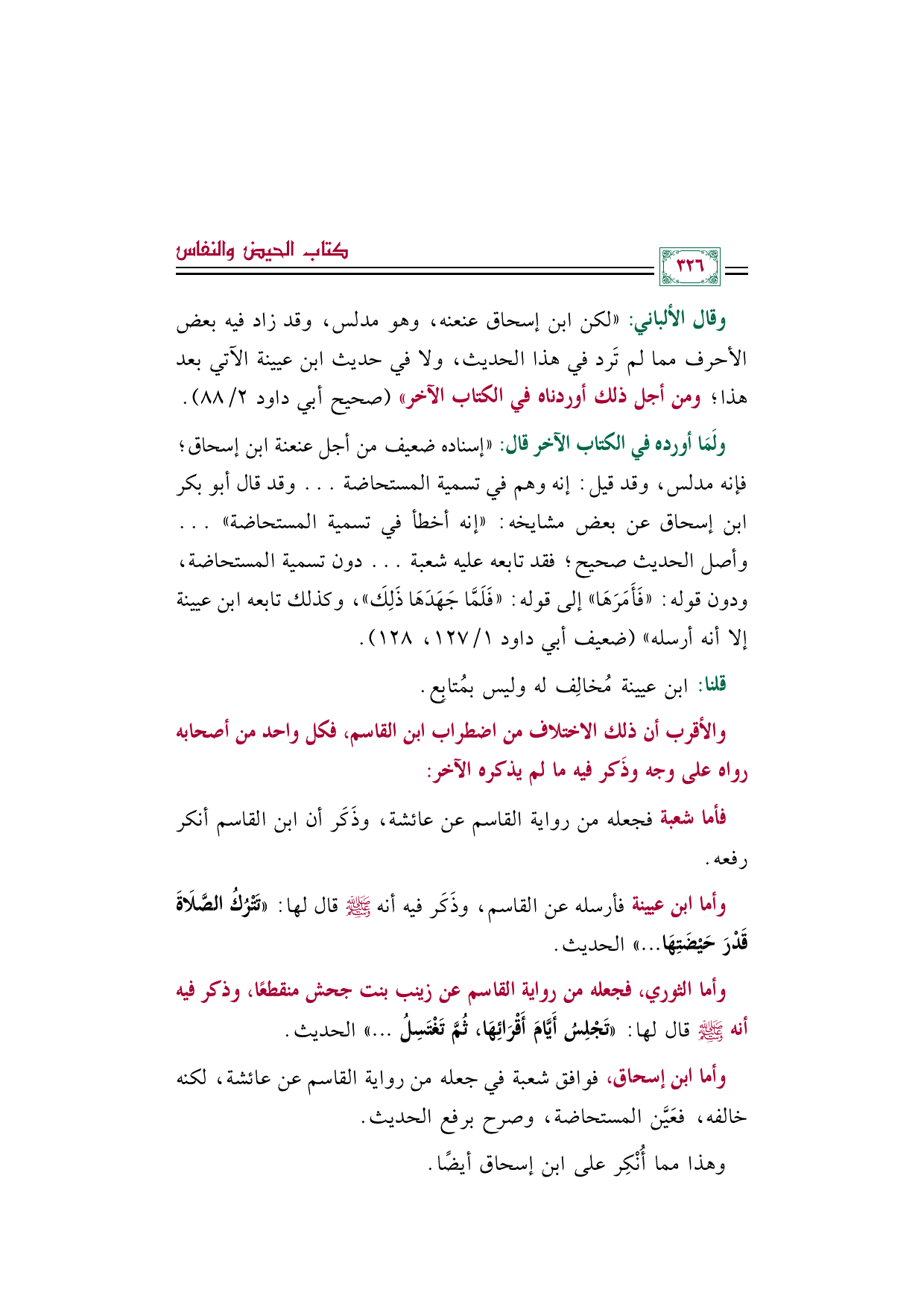 ولَمَا أورده في الكتاب الآخر قال: ((إسناده ضعيف من أجل عنعنة ابن إسحاق؛ فإنه مدلس، وقد قيل: إنه وهم في تسمية المستحاضة ... وقد قال أبو بكر بن إسحاق عن بعض مشايخه: ((إنه أخطأ في تسمية المستحاضة)) ... وأصل الحديث صحيح؛ فقد تابعه عليه شعبة ... دون تسمية المستحاضة، ودون قوله: ((فَأَمَرَهَا)) إلى قوله: ((فَلَمَّا جَهَدَهَا ذَلِكَ))، وكذلك تابعه ابن عيينة إلا أنه أرسله)) (ضعيف أبي داود ١/ ١٢٧، ١٢٨) ـ.