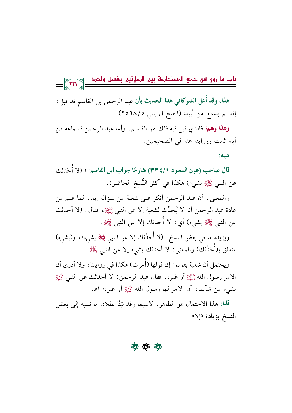 قال صاحب (عون المعبود ١/ ٣٣٤) شارحًا جواب ابن القاسم: (((لا أُحَدثك عن النبي صلى الله عليه وسلم بشيء) هكذا في أكثر النُّسخ الحاضرة.