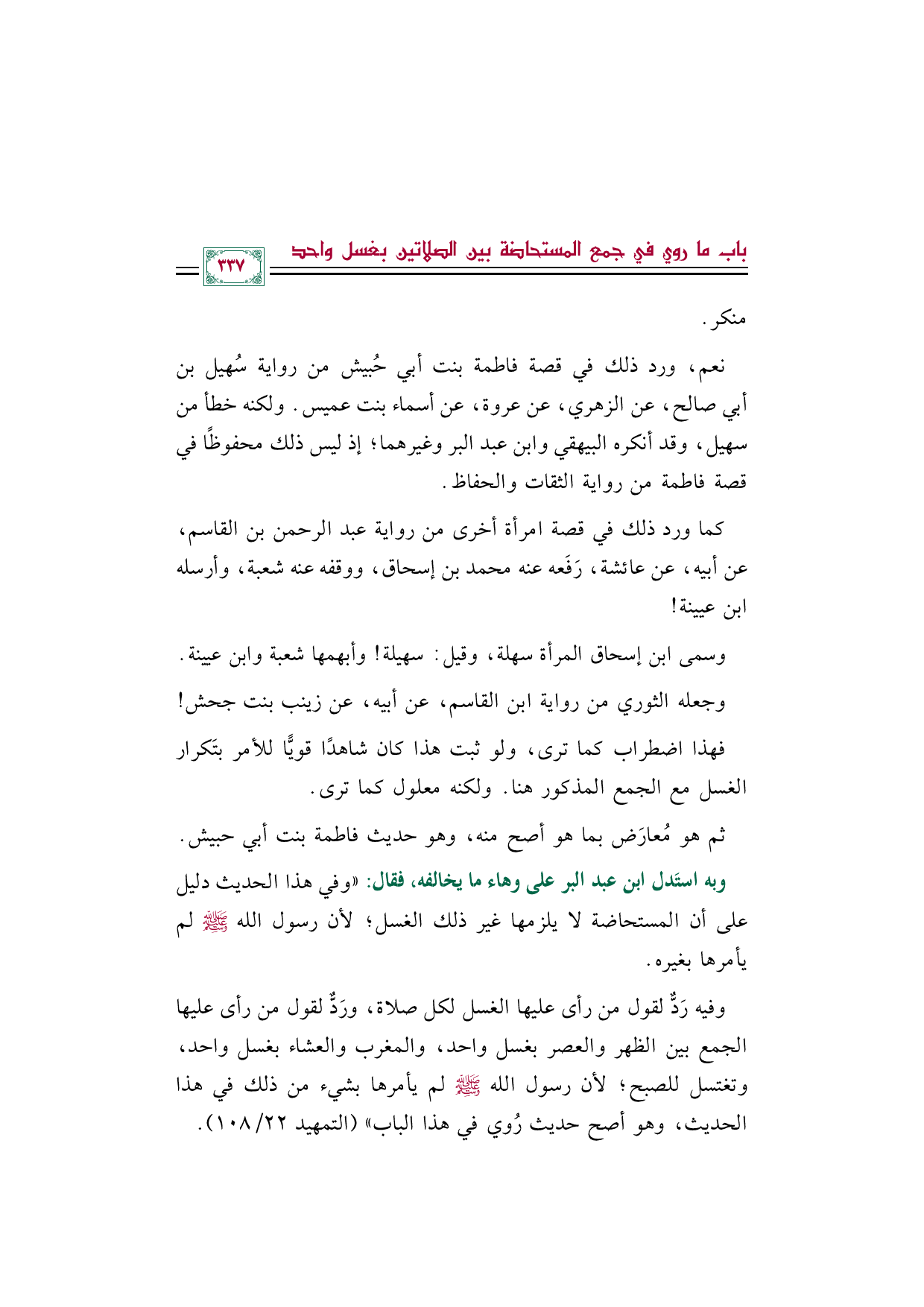 وفيه رَدٌّ لقول من رأى عليها الغسل لكل صلاة، ورَدٌّ لقول من رأى عليها الجمع بين الظهر والعصر بغسل واحد، والمغرب والعشاء بغسل واحد، وتغتسل للصبح؛ لأن رسول الله صلى الله عليه وسلم لم يأمرها بشيء من ذلك في هذا الحديث، وهو أصح حديث رُوي في هذا الباب)) (التمهيد ٢٢/ ١٠٨).