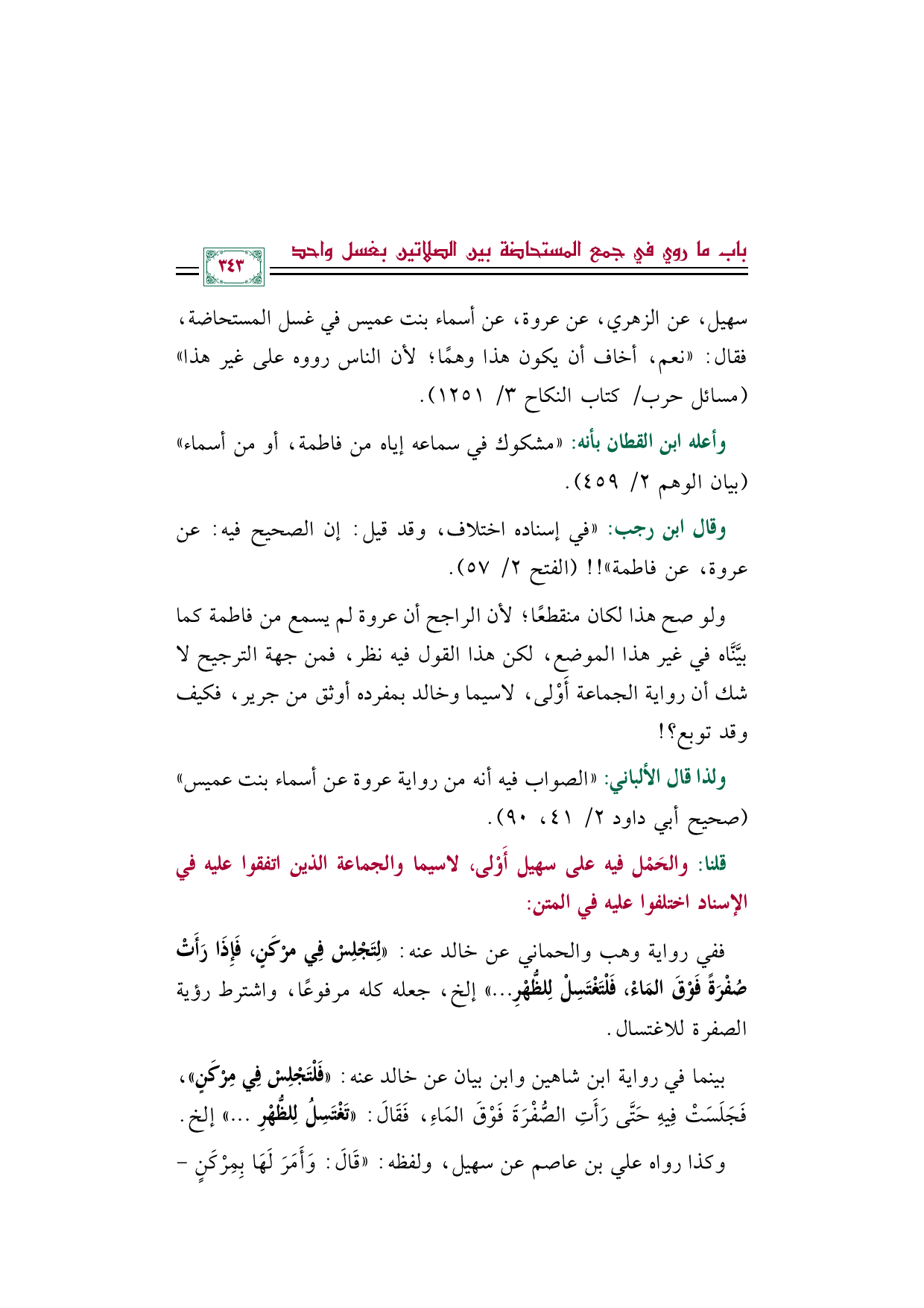 ولو صح هذا لكان منقطعًا؛ لأن الراجح أن عروة لم يسمع من فاطمة كما بيَّنَّاه في غير هذا الموضع، لكن هذا القول فيه نظر، فمن جهة الترجيح لا شك أن رواية الجماعة أَوْلى، لاسيما وخالد بمفرده أوثق من جرير، فكيف وقد توبع؟ !