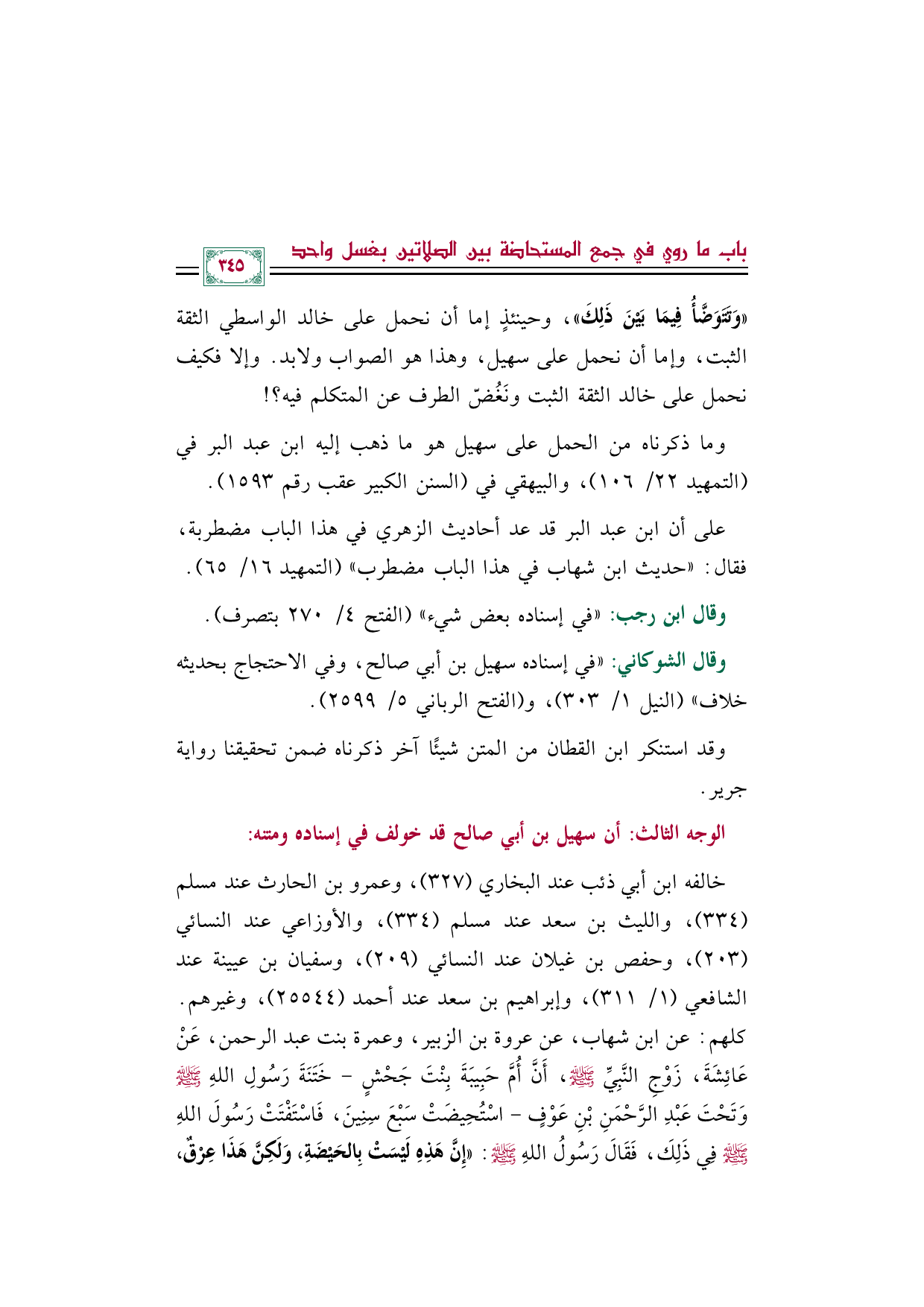 ((وَتَتَوَضَّأُ فِيمَا بَيْنَ ذَلِكَ))، وحينئذٍ إما أن نحمل على خالد الواسطي الثقة الثبت، وإما أن نحمل على سهيل، وهذا هو الصواب ولابد. وإلا فكيف نحمل على خالد الثقة الثبت ونَغُضّ الطرف عن المتكلم فيه؟ !