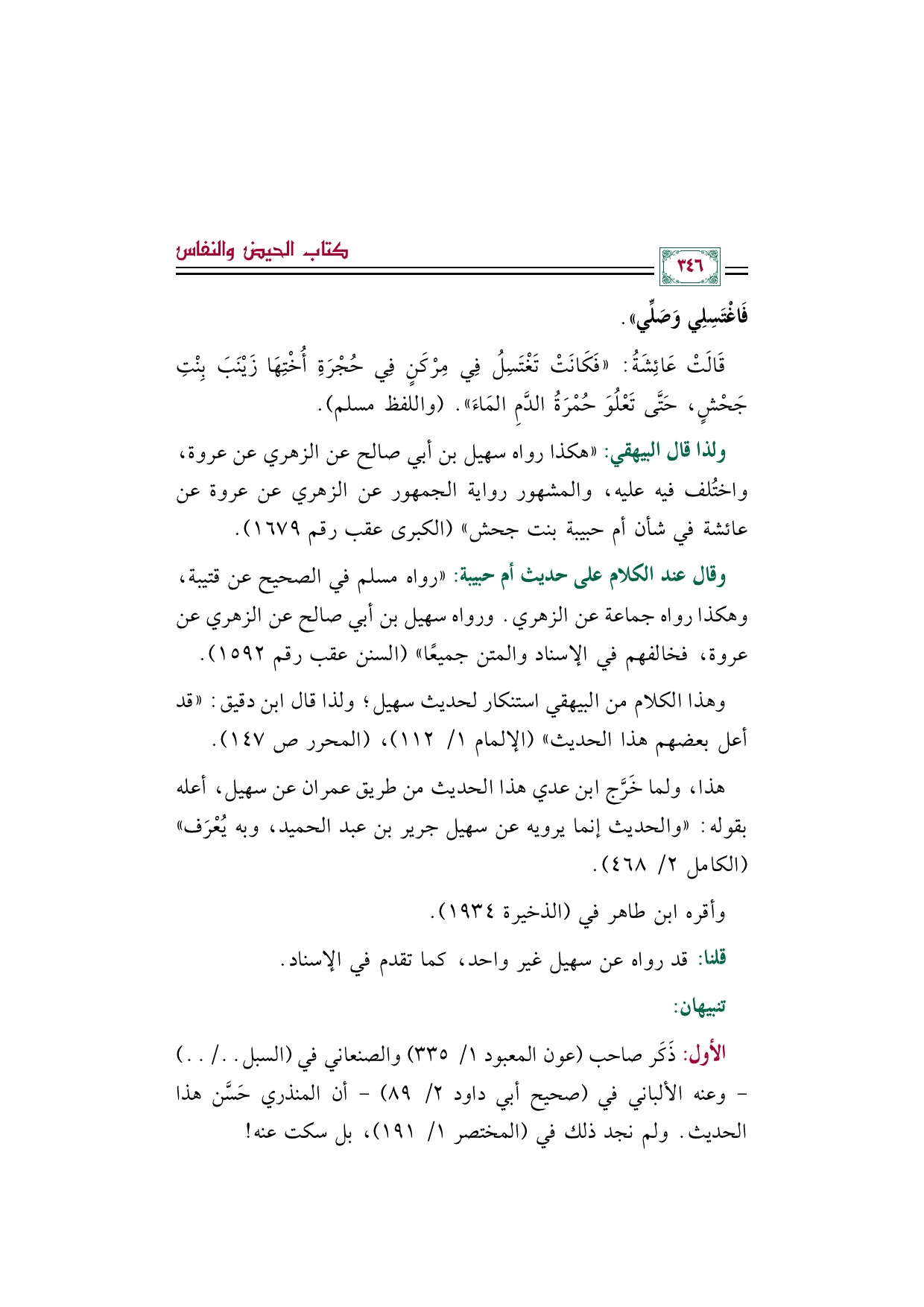 ولذا قال البيهقي: ((هكذا رواه سهيل بن أبي صالح عن الزهري عن عروة، واختُلف فيه عليه، والمشهور رواية الجمهور عن الزهري عن عروة عن عائشة في شأن أم حبيبة بنت جحش)) (الكبرى عقب رقم ١٦٧٩).