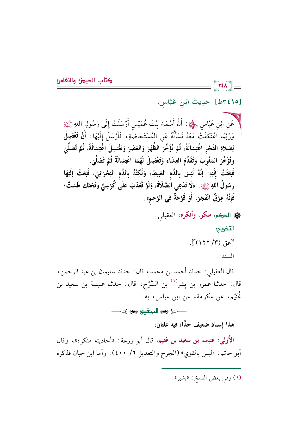 قال العقيلي: حدثنا أحمد بن محمد، قال: حدثنا سليمان بن عبد الرحمن، قال: حدثنا عمرو بن بِشر (¬١) بن السَّرْح، قال: حدثنا عنبسة بن سعيد بن غُنَيْم، عن عكرمة، عن ابن عباس، به.