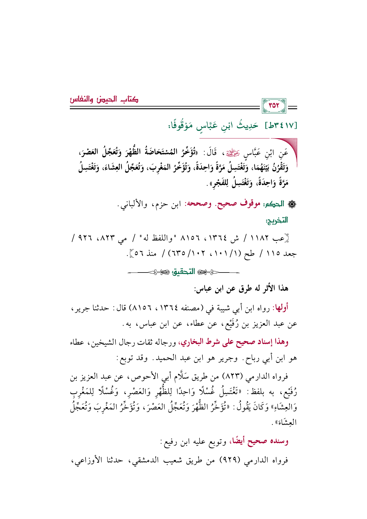 فرواه الدارمي (٨٢٣) من طريق سَلَّام أبي الأحوص، عن عبد العزيز بن رُفَيْع، به بلفظ: ((تَغْتَسِلُ غُسْلًا وَاحِدًا لِلظُّهْرِ وَالعَصْرِ، وَغُسْلًا لِلمَغْرِبِ وَالعِشَاءِ)) وَكَانَ يَقُولُ: ((تُؤَخِّرُ الظُّهْرَ وَتُعَجِّلُ العَصْرَ، وَتُؤَخِّرُ المَغْرِبَ وَتُعَجِّلُ العِشَاءَ)).