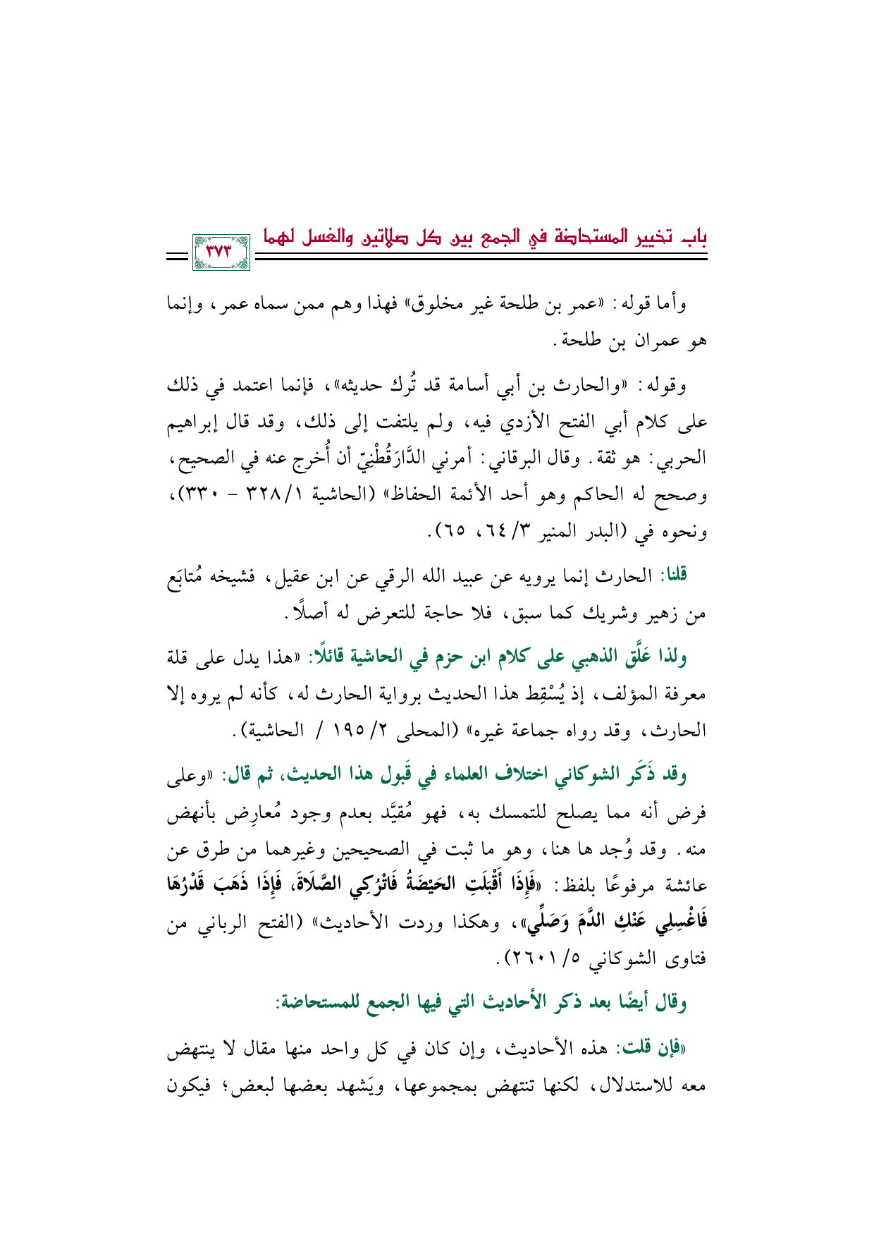وقوله: ((والحارث بن أبي أسامة قد تُرك حديثه))، فإنما اعتمد في ذلك على كلام أبي الفتح الأزدي فيه، ولم يلتفت إلى ذلك، وقد قال إبراهيم الحربي: هو ثقة. وقال البرقاني: أمرني الدَّارَقُطْنِيّ أن أُخرج عنه في الصحيح، وصحح له الحاكم وهو أحد الأئمة الحفاظ)) (الحاشية ١/ ٣٢٨ - ٣٣٠)، ونحوه في (البدر المنير ٣/ ٦٤، ٦٥).