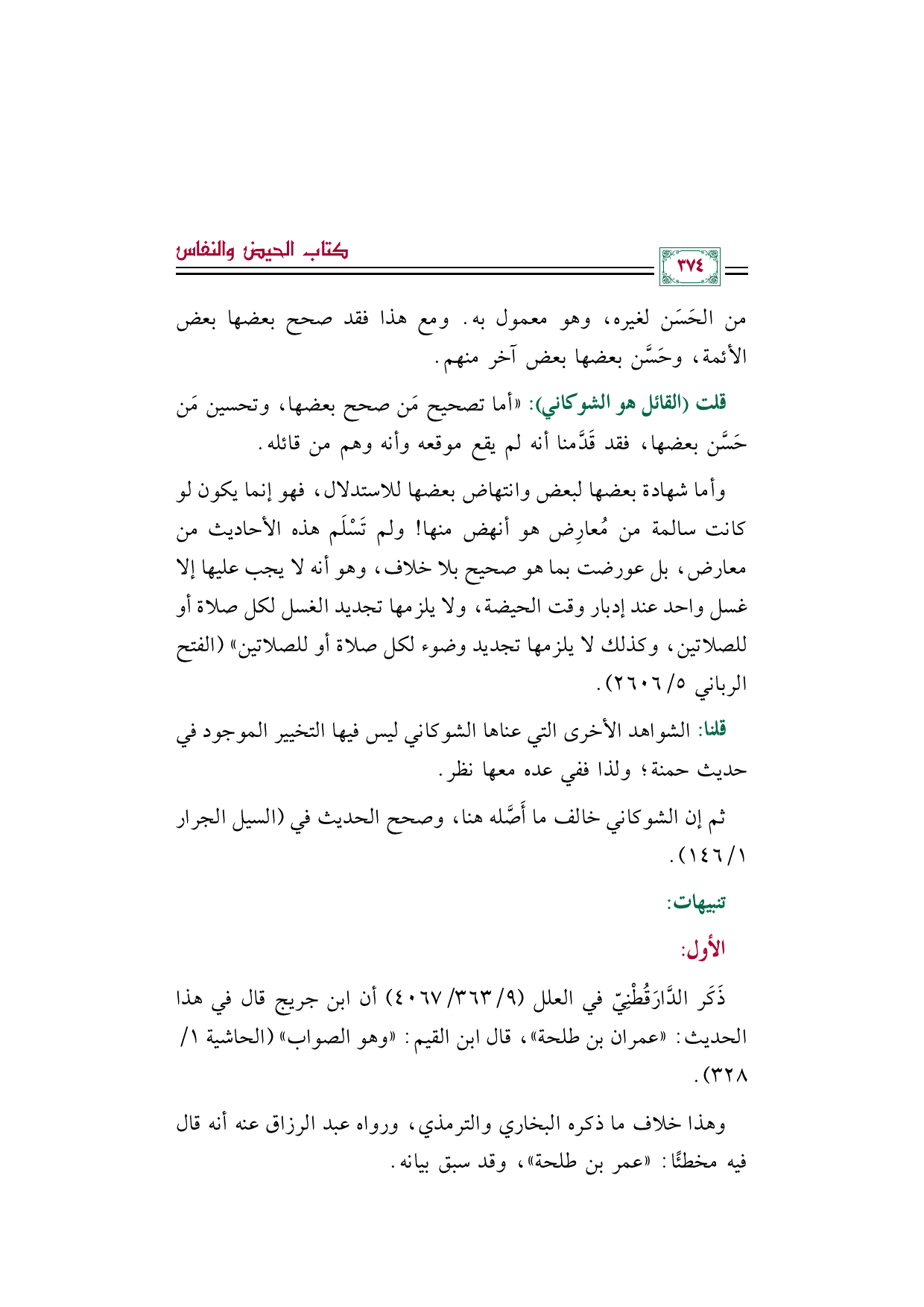 قلنا: الشواهد الأخرى التي عناها الشوكاني ليس فيها التخيير الموجود في حديث حمنة؛ ولذا ففي عده معها نظر.