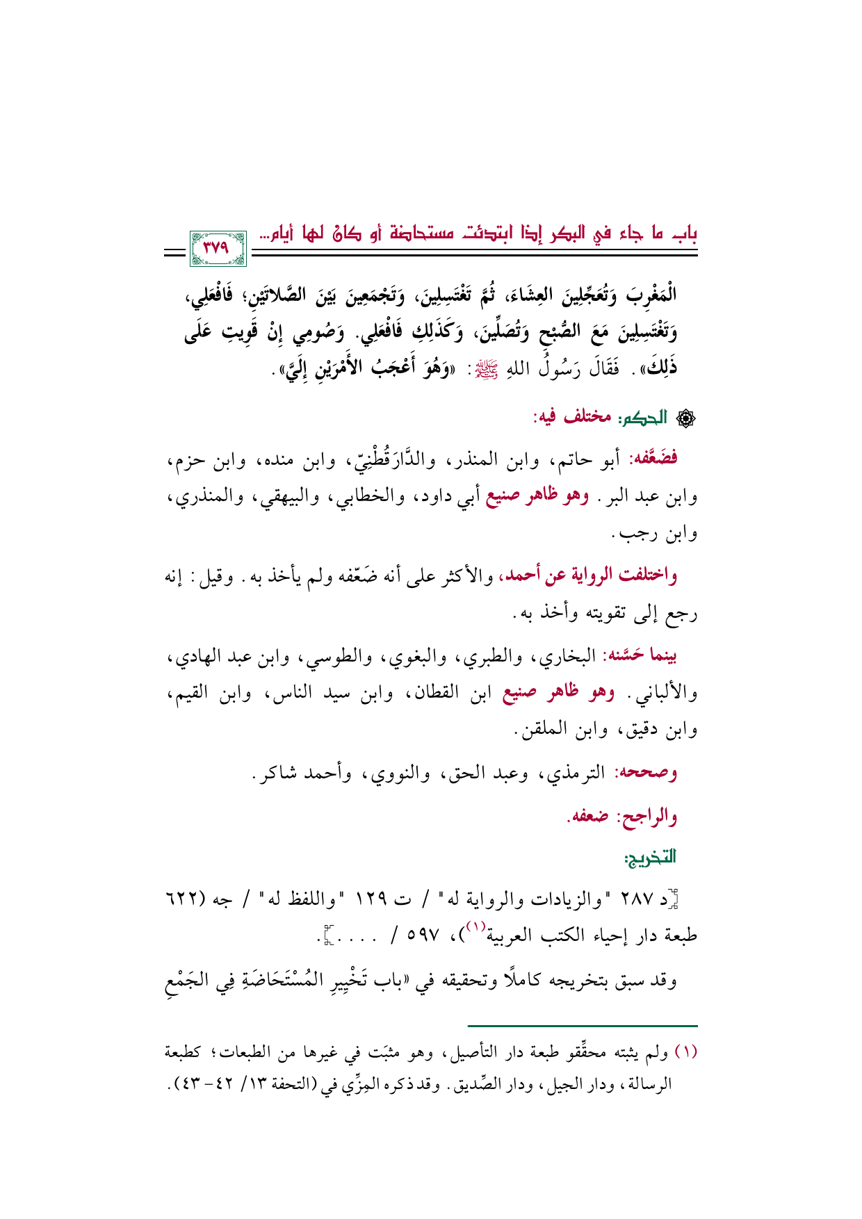 وقد سبق بتخريجه كاملًا وتحقيقه في (باب تَخْيِيرِ المُسْتَحَاضَةِ فِي الجَمْعِ