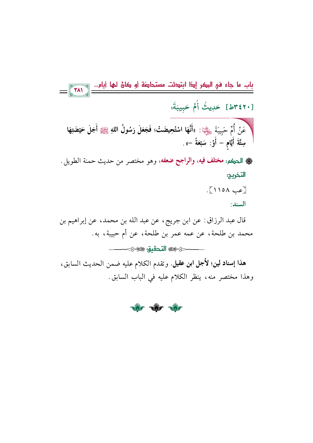 ◼ عَنْ أُمِّ حَبِيبَةَ رَضِيَ اللهُ عَنْهَا: ((أَنَّهَا اسْتُحِيضَتْ؛ فَجَعَلَ رَسُولُ اللهِ صَلَّى اللهُ عَلَيْهِ وَسَلَّمَ أَجَلَ حَيْضَتِهَا سِتَّةَ أَيَّامٍ- أَوْ: سَبْعَةً-)).