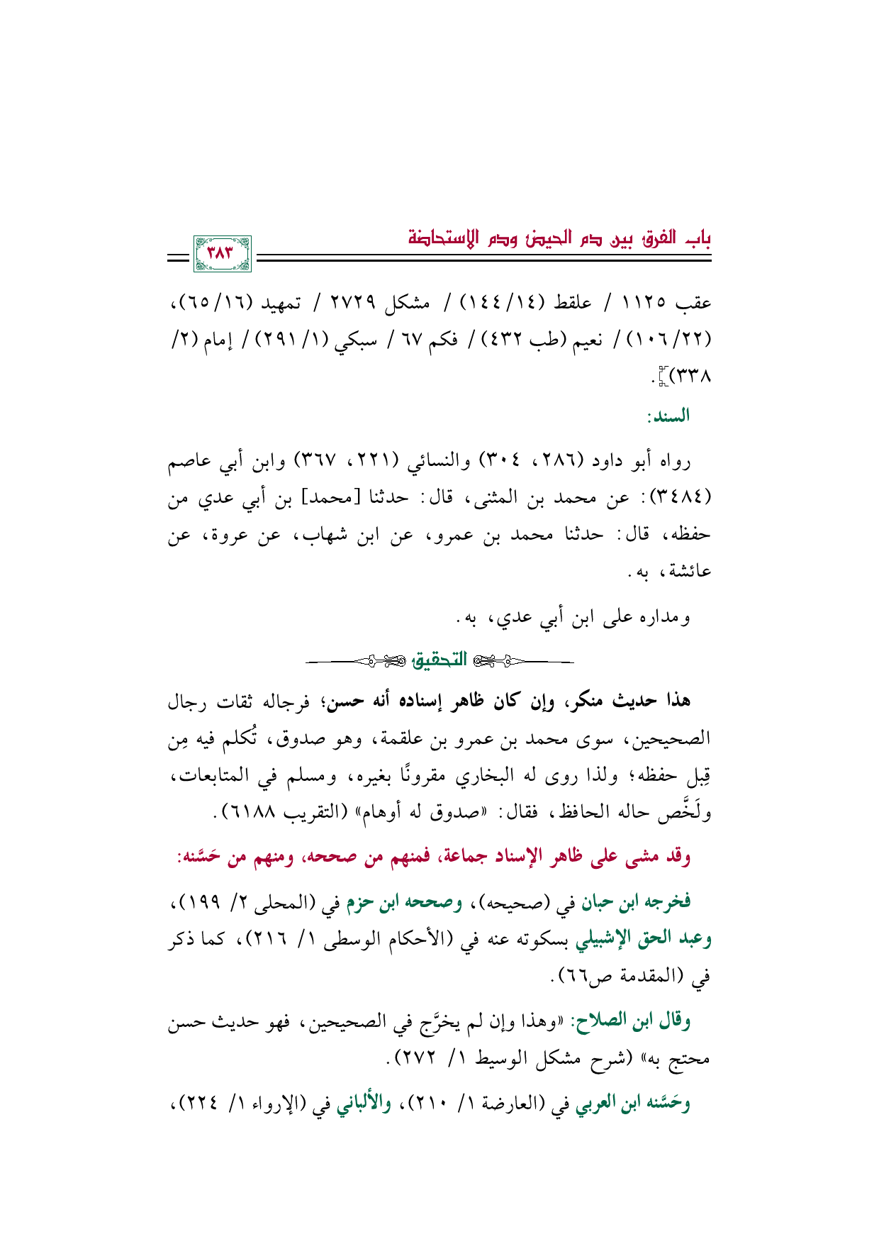 رواه أبو داود (٢٨٦، ٣٠٤) والنسائي (٢٢١، ٣٦٧) وابن أبي عاصم (٣٤٨٤): عن محمد بن المثنى، قال: حدثنا [محمد] بن أبي عدي من حفظه، قال: حدثنا محمد بن عمرو، عن ابن شهاب، عن عروة، عن عائشة، به.
