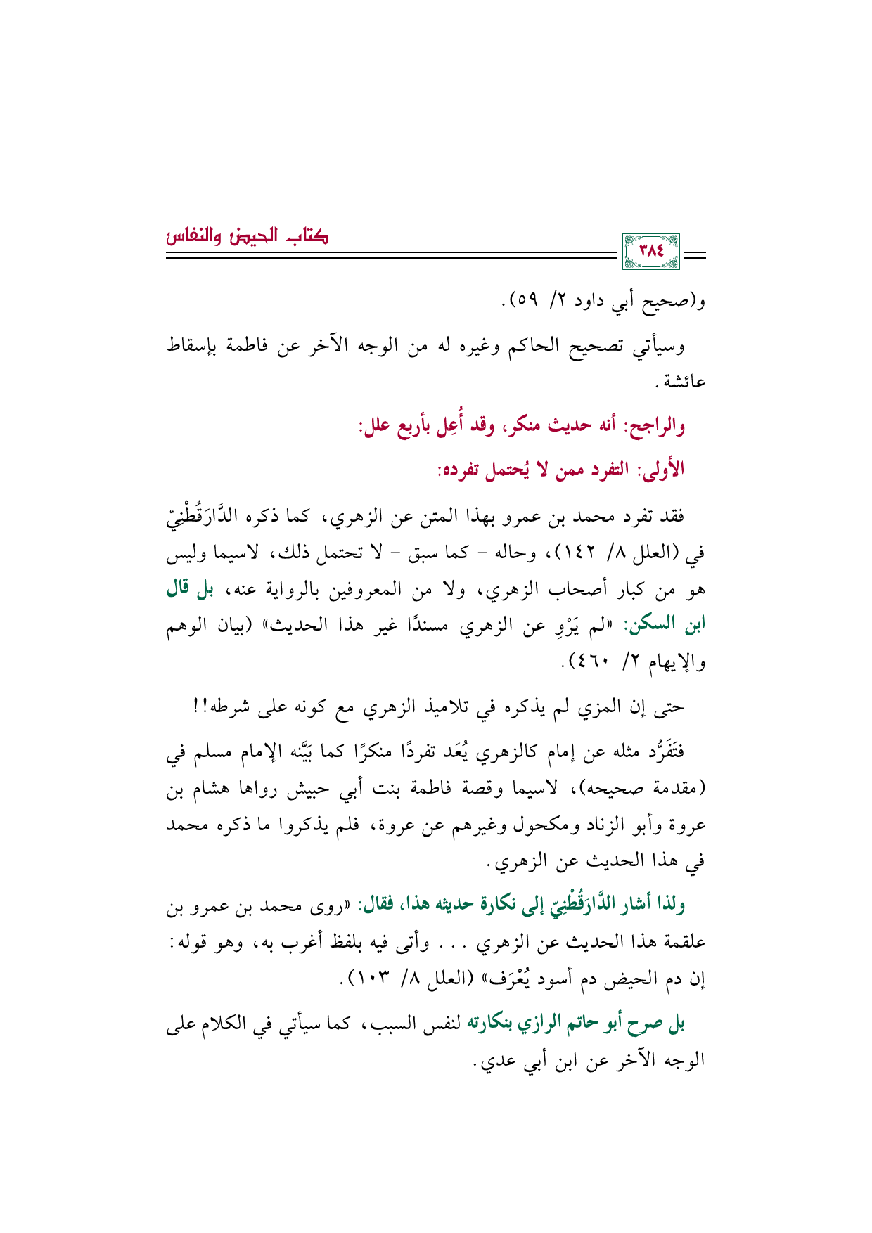 ولذا أشار الدَّارَقُطْنِيّ إلى نكارة حديثه هذا، فقال: ((روى محمد بن عمرو بن علقمة هذا الحديث عن الزهري ... وأتى فيه بلفظ أغرب به، وهو قوله: إن دم الحيض دم أسود يُعْرَف)) (العلل ٨/ ١٠٣).