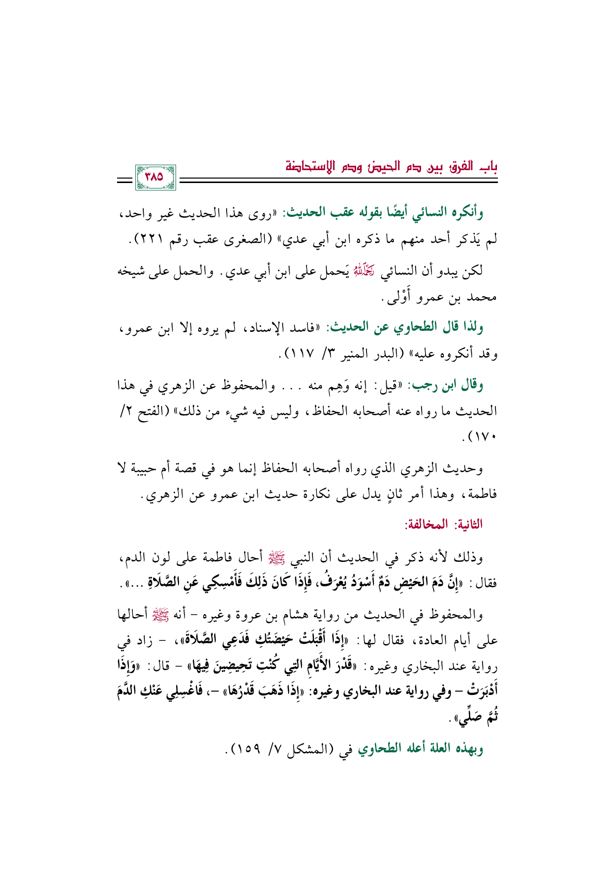 والمحفوظ في الحديث من رواية هشام بن عروة وغيره- أنه صلى الله عليه وسلم أحالها على أيام العادة، فقال لها: ((إِذَا أَقْبَلَتْ حَيْضَتُكِ فَدَعِي الصَّلَاةَ))، - زاد في رواية عند البخاري وغيره: ((قَدْرَ الأَيَّامِ التِي كُنْتِ تَحِيضِينَ فِيهَا)) - قال: ((وَإِذَا أَدْبَرَتْ -وفي رواية عند البخاري وغيره: ((إِذَا ذَهَبَ قَدْرُهَا)) -، فَاغْسِلِي عَنْكِ الدَّمَ ثُمَّ صَلِّي)).