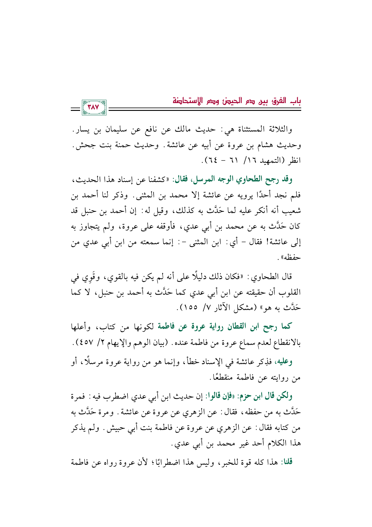 وقد رجح الطحاوي الوجه المرسل، فقال: ((كشفنا عن إسناد هذا الحديث، فلم نجد أحدًا يرويه عن عائشة إلا محمد بن المثنى. وذكر لنا أحمد بن شعيب أنه أنكر عليه لما حَدَّث به كذلك، وقيل له: إن أحمد بن حنبل قد كان حَدَّث به عن محمد بن أبي عدي، فأوقفه على عروة، ولم يتجاوز به إلى عائشة! فقال -أي: ابن المثنى-: إنما سمعته من ابن أبي عدي من حفظه)).