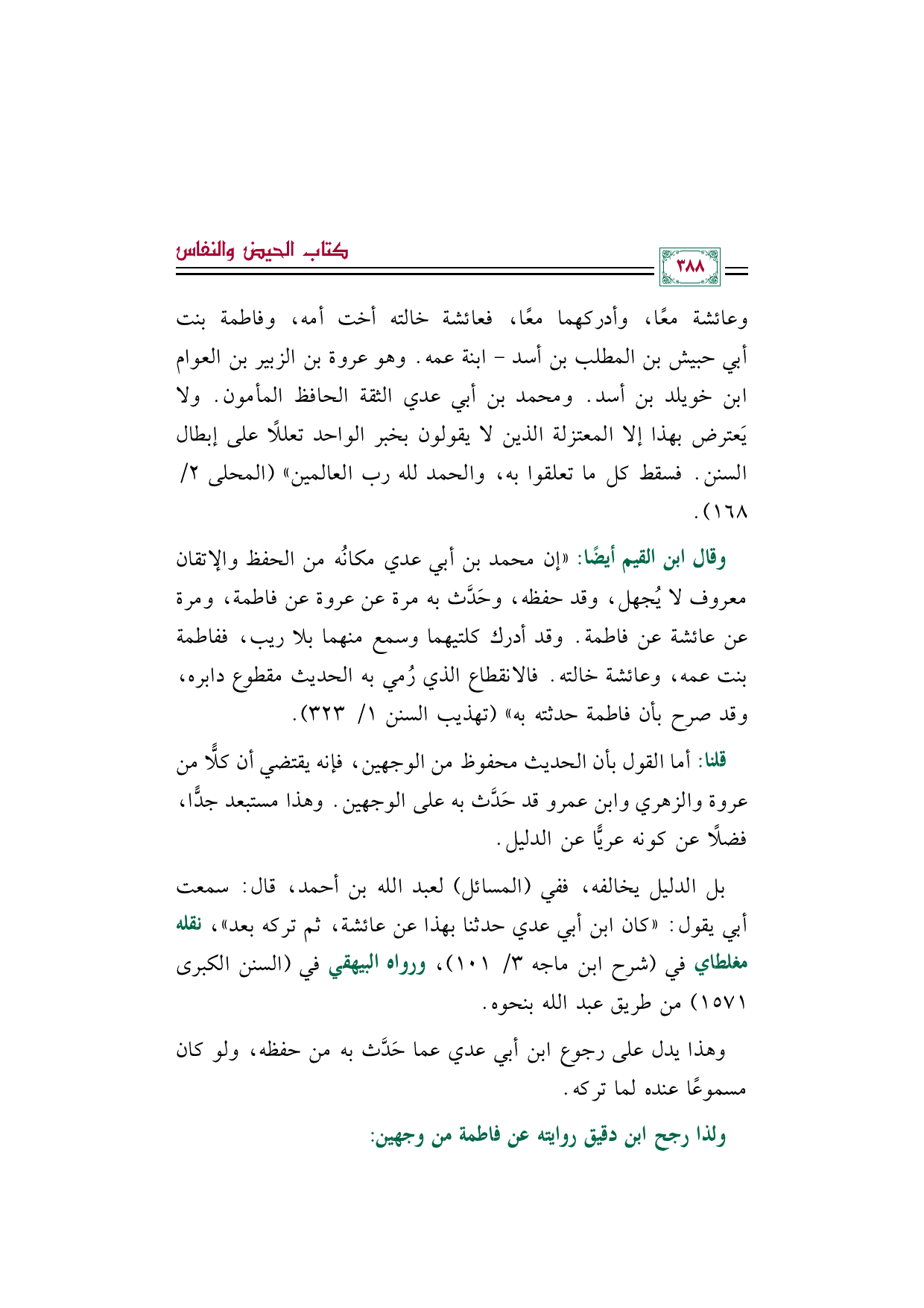 وقال ابن القيم أيضًا: ((إن محمد بن أبي عدي مكانُه من الحفظ والإتقان معروف لا يُجهل، وقد حفظه، وحَدَّث به مرة عن عروة عن فاطمة، ومرة عن عائشة عن فاطمة. وقد أدرك كلتيهما وسمع منهما بلا ريب، ففاطمة بنت عمه، وعائشة خالته. فالانقطاع الذي رُمي به الحديث مقطوع دابره، وقد صرح بأن فاطمة حدثته به)) (تهذيب السنن ١/ ٣٢٣).