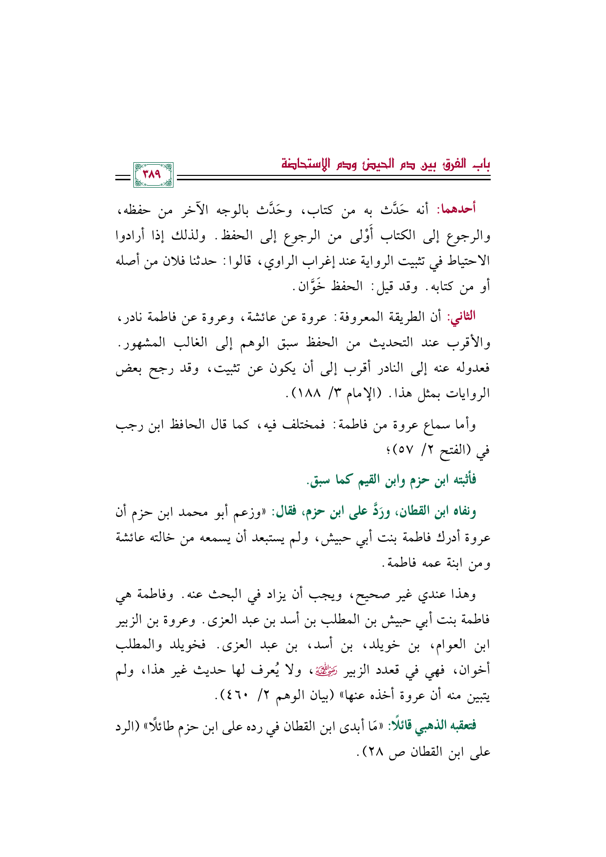 الثاني: أن الطريقة المعروفة: عروة عن عائشة، وعروة عن فاطمة نادر، والأقرب عند التحديث من الحفظ سبق الوهم إلى الغالب المشهور. فعدوله عنه إلى النادر أقرب إلى أن يكون عن تثبيت، وقد رجح بعض الروايات بمثل هذا. (الإمام ٣/ ١٨٨).
