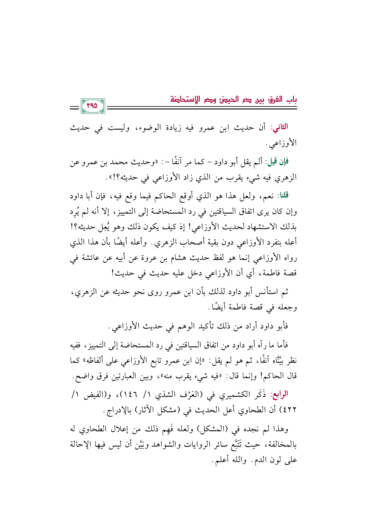 قلنا: نعم، ولعل هذا هو الذي أوقع الحاكم فيما وقع فيه، فإن أبا داود وإن كان يرى اتفاق السياقتين في رد المستحاضة إلى التمييز، إلا أنه لم يُرِد بذلك الاستشهاد لحديث الأوزاعي! إذ كيف يكون ذلك وهو يُعِل حديثه؟ ! أعله بتفرد الأوزاعي دون بقية أصحاب الزهري. وأعله أيضًا بأن هذا الذي رواه الأوزاعي إنما هو لفظ حديث هشام بن عروة عن أبيه عن عائشة في قصة فاطمة، أي أن الأوزاعي دخل عليه حديث في حديث!
