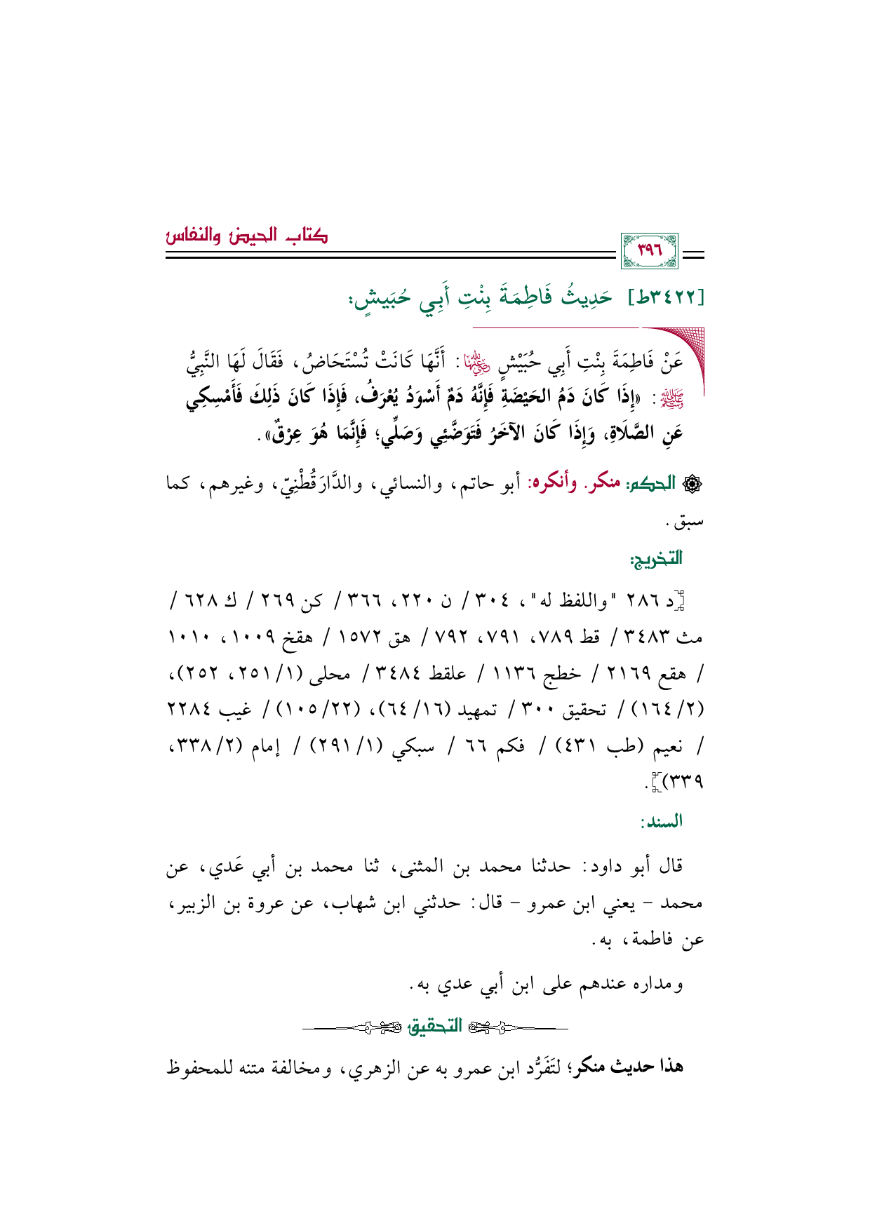 ٣٤٢٢ - حَدِيثُ فَاطِمَةَ بِنْتِ أَبِي حُبَيشٍ: