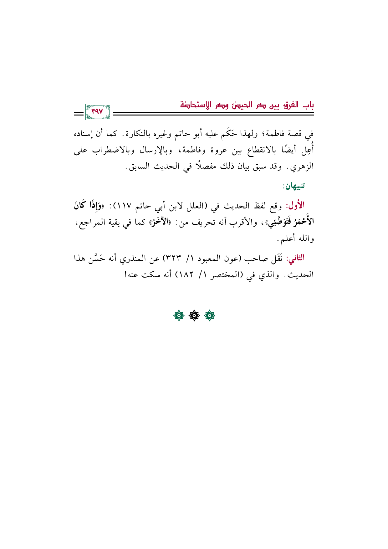 الأول: وقع لفظ الحديث في (العلل لابن أبي حاتم ١١٧): ((وَإِذَا كَانَ الأَحْمَرُ فَتَوَضَّئِي))، والأقرب أنه تحريف من: ((الآخَرُ)) كما في بقية المراجع، والله أعلم.