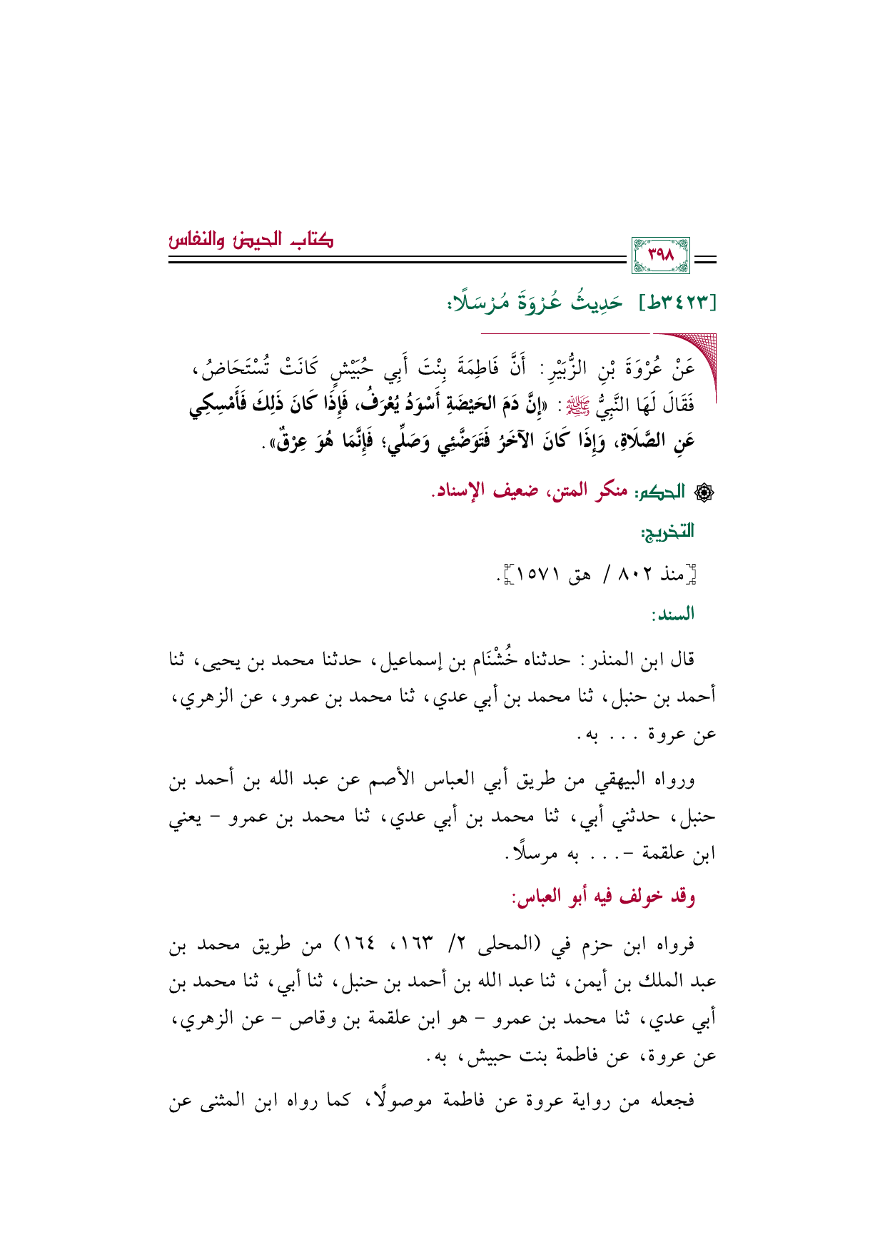 فرواه ابن حزم في (المحلى ٢/ ١٦٣، ١٦٤) من طريق محمد بن عبد الملك بن أيمن، ثنا عبد الله بن أحمد بن حنبل، ثنا أبي، ثنا محمد بن أبي عدي، ثنا محمد بن عمرو- هو ابن علقمة بن وقاص- عن الزهري، عن عروة، عن فاطمة بنت حبيش، به.