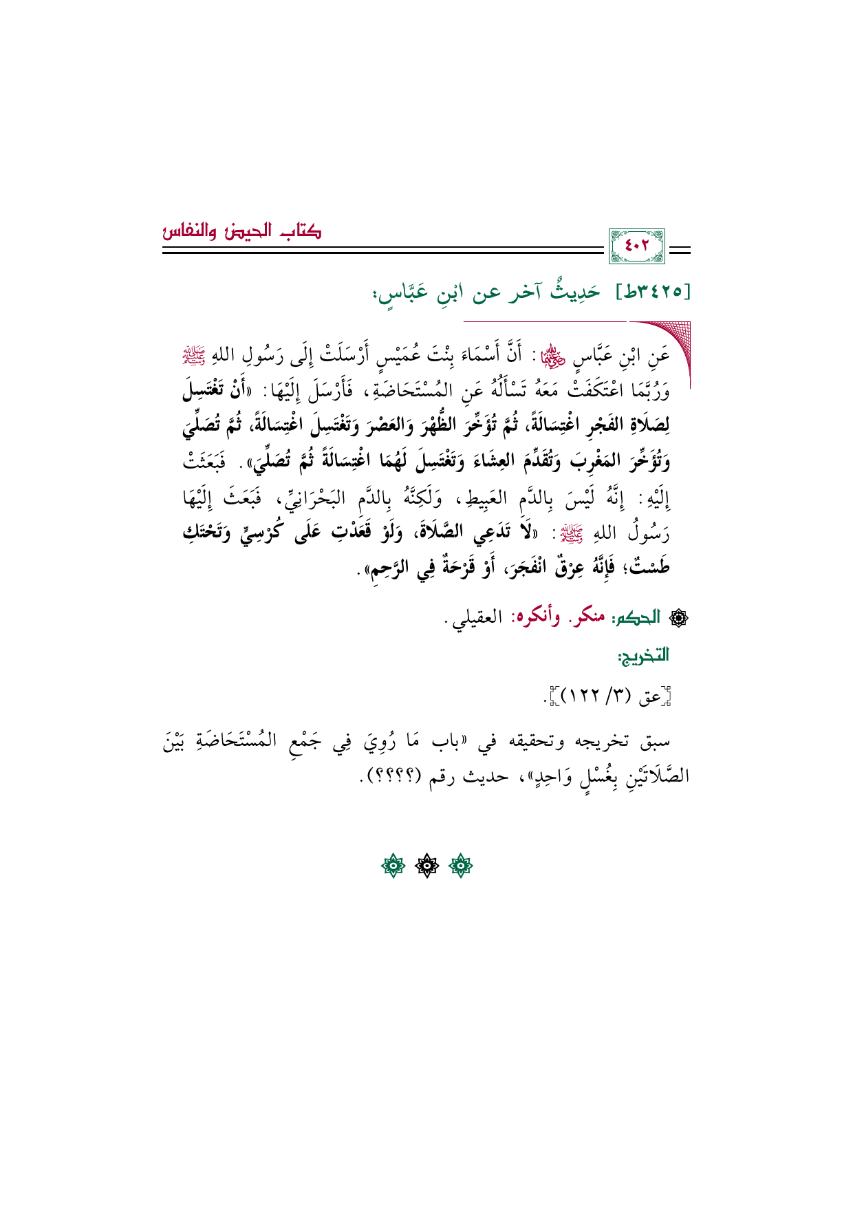 ◼ عَنِ ابْنِ عَبَّاسٍ رضي الله عنهما: أَنَّ أَسْمَاءَ بِنْتَ عُمَيْسٍ أَرْسَلَتْ إِلَى رَسُولِ اللهِ صَلَّى اللهُ عَلَيْهِ وَسَلَّمَ وَرُبَّمَا اعْتَكَفَتْ مَعَهُ تَسْأَلُهُ عَنِ المُسْتَحَاضَةِ، فَأَرْسَلَ إِلَيْهَا: ((أَنْ تَغْتَسِلَ لِصَلَاةِ الفَجْرِ اغْتِسَالَةً، ثُمَّ تُؤَخِّرَ الظُّهْرَ وَالعَصْرَ وَتَغْتَسِلَ اغْتِسَالَةً، ثُمَّ تُصَلِّيَ وَتُؤَخِّرَ المَغْرِبَ وَتُقَدِّمَ العِشَاءَ وَتَغْتَسِلَ لَهُمَا اغْتِسَالَةً ثُمَّ تُصَلِّيَ)). فَبَعَثَتْ إِلَيْهِ: إِنَّهُ لَيْسَ بِالدَّمِ العَبِيطِ، وَلَكِنَّهُ بِالدَّمِ البَحْرَانِيِّ، فَبَعَثَ إِلَيْهَا رَسُولُ اللهِ صَلَّى اللهُ عَلَيْهِ وَسَلَّمَ: ((لَا تَدَعِي الصَّلَاةَ، وَلَوْ قَعَدْتِ عَلَى كُرْسِيٍّ وَتَحْتَكِ طَسْتٌ؛ فَإِنَّهُ عِرْقٌ انْفَجَرَ، أَوْ قَرْحَةٌ فِي الرَّحِمِ)).