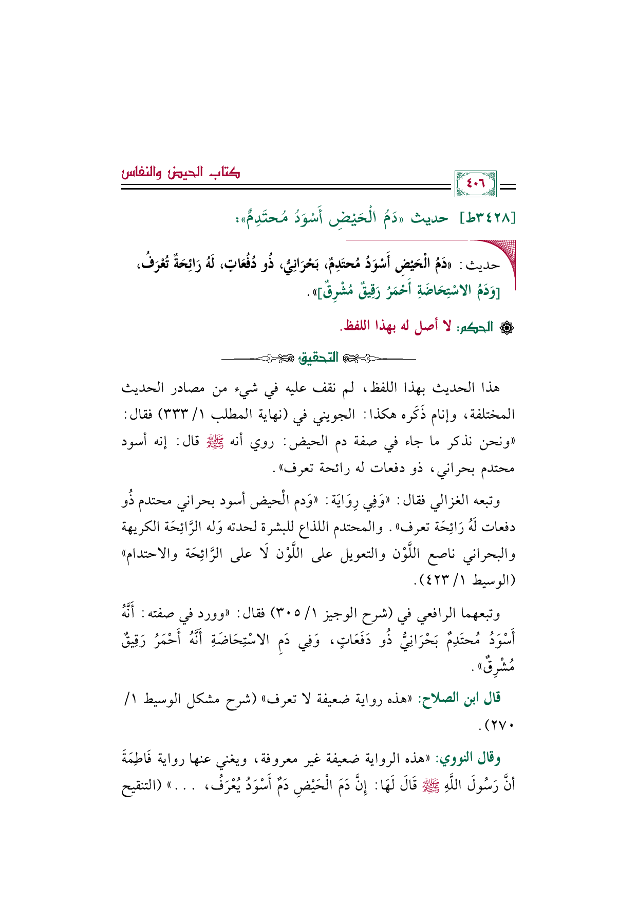 وتبعهما الرافعي في (شرح الوجيز ١/ ٣٠٥) فقال: ((وورد في صفته: أَنَّهُ أَسْوَدُ مُحتَدِمٌ بَحْرَانِيُّ ذُو دَفَعَاتٍ، وَفِي دَمِ الاسْتِحَاضَةِ أَنَّهُ أَحْمَرُ رَقِيقٌ مُشْرِقٌ)).