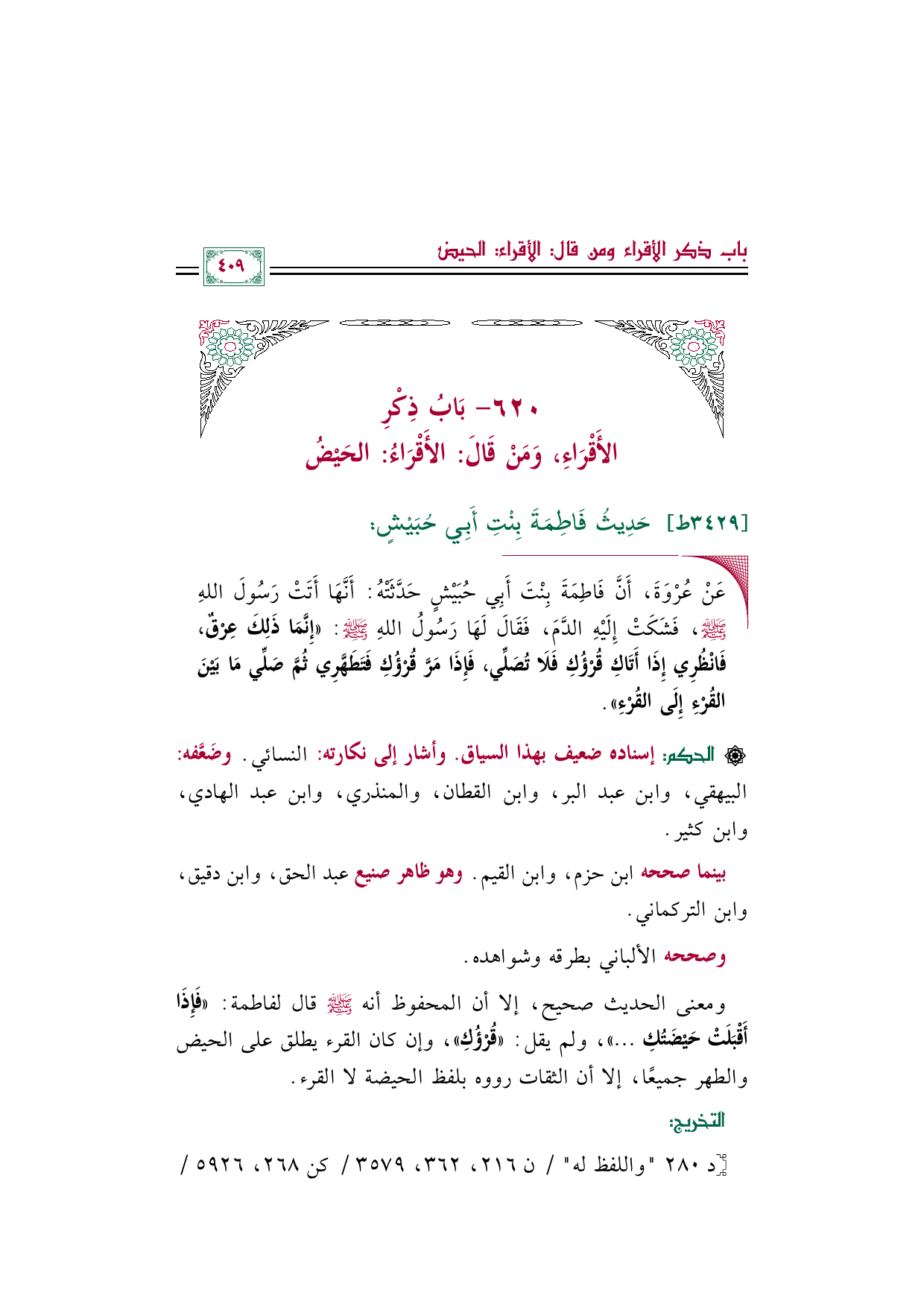 ومعنى الحديث صحيح، إلا أن المحفوظ أنه صلى الله عليه وسلم قال لفاطمة: ((فَإِذَا أَقْبَلَتْ حَيْضَتُكِ ... ))، ولم يقل: ((قُرْؤُكِ))، وإن كان القرء يطلق على الحيض والطهر جميعًا، إلا أن الثقات رووه بلفظ الحيضة لا القرء.