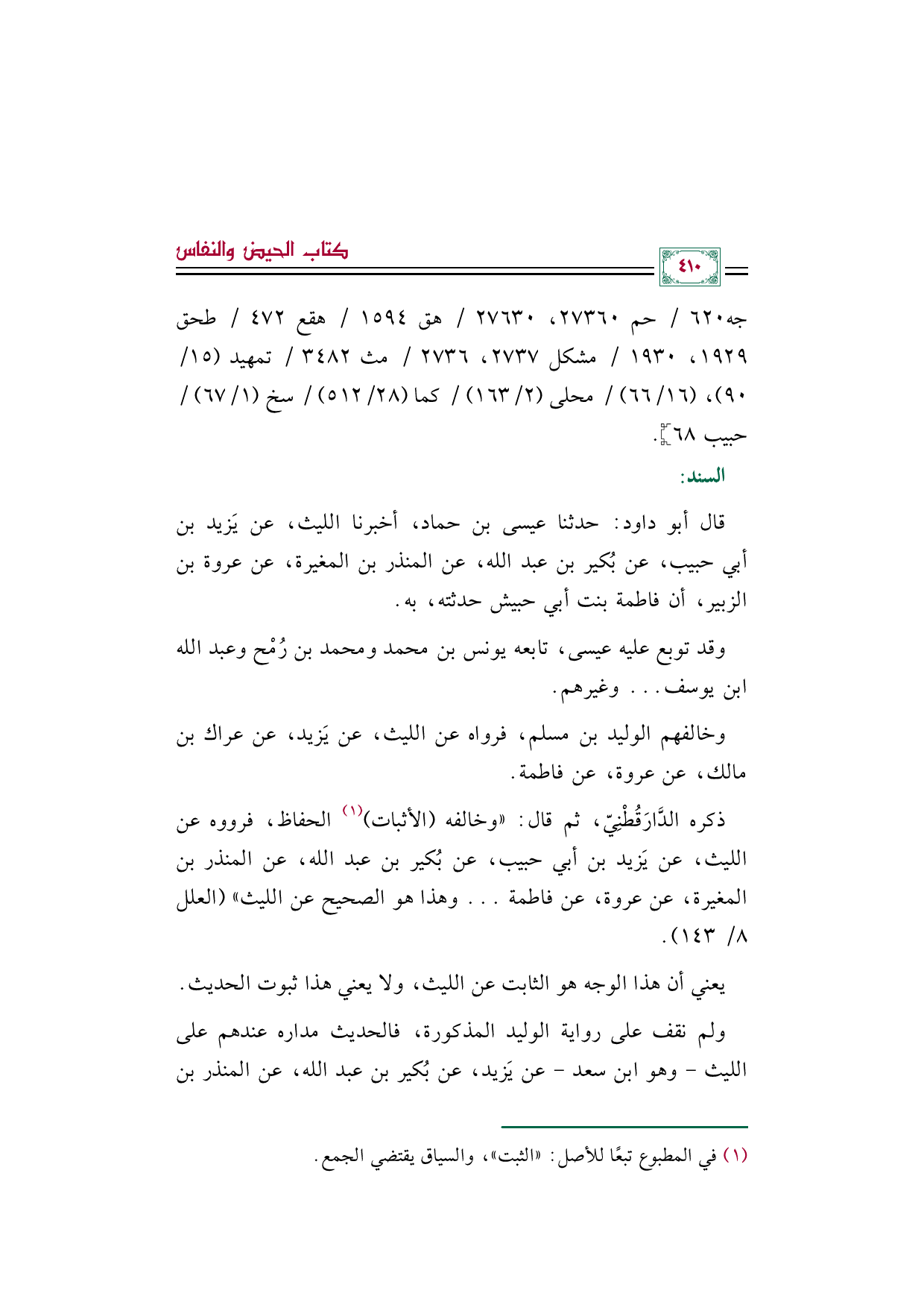 قال أبو داود: حدثنا عيسى بن حماد، أخبرنا الليث، عن يَزيد بن أبي حبيب، عن بُكير بن عبد الله، عن المنذر بن المغيرة، عن عروة بن الزبير، أن فاطمة بنت أبي حبيش حدثته، به.